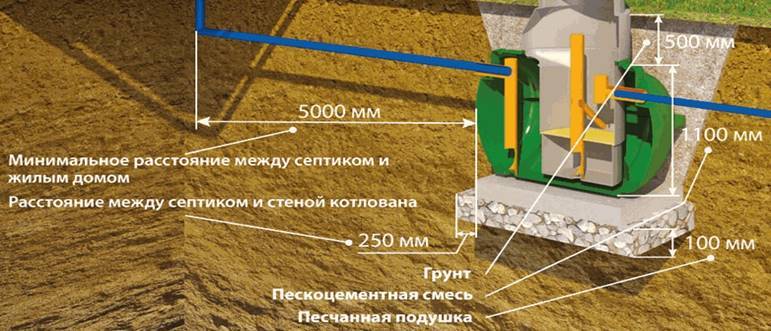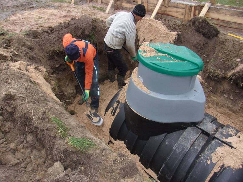 La méthode d'installation d'une fosse septique dépend du niveau des eaux souterraines. S'ils sont suffisamment profonds, le fond de la fosse doit être percuté et un coussin de sable de 100 à 300 mm d'épaisseur doit être posé dessus. Une fosse septique y est installée - strictement au centre de la fosse, de sorte qu'il y ait un espace de 300 mm entre le sol et le récipient en plastique.