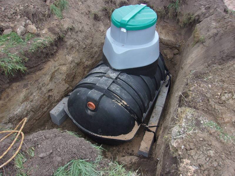 Si l'humidité du sol est élevée, une dalle en béton armé avec des pattes encastrées doit être posée au fond de la fosse. La fosse septique doit y être attachée avec des sangles en plastique, l'empêchant ainsi de faire surface. Au lieu d'une dalle comme ancre, vous pouvez utiliser des bordures en béton standard à raison de 4 pièces.