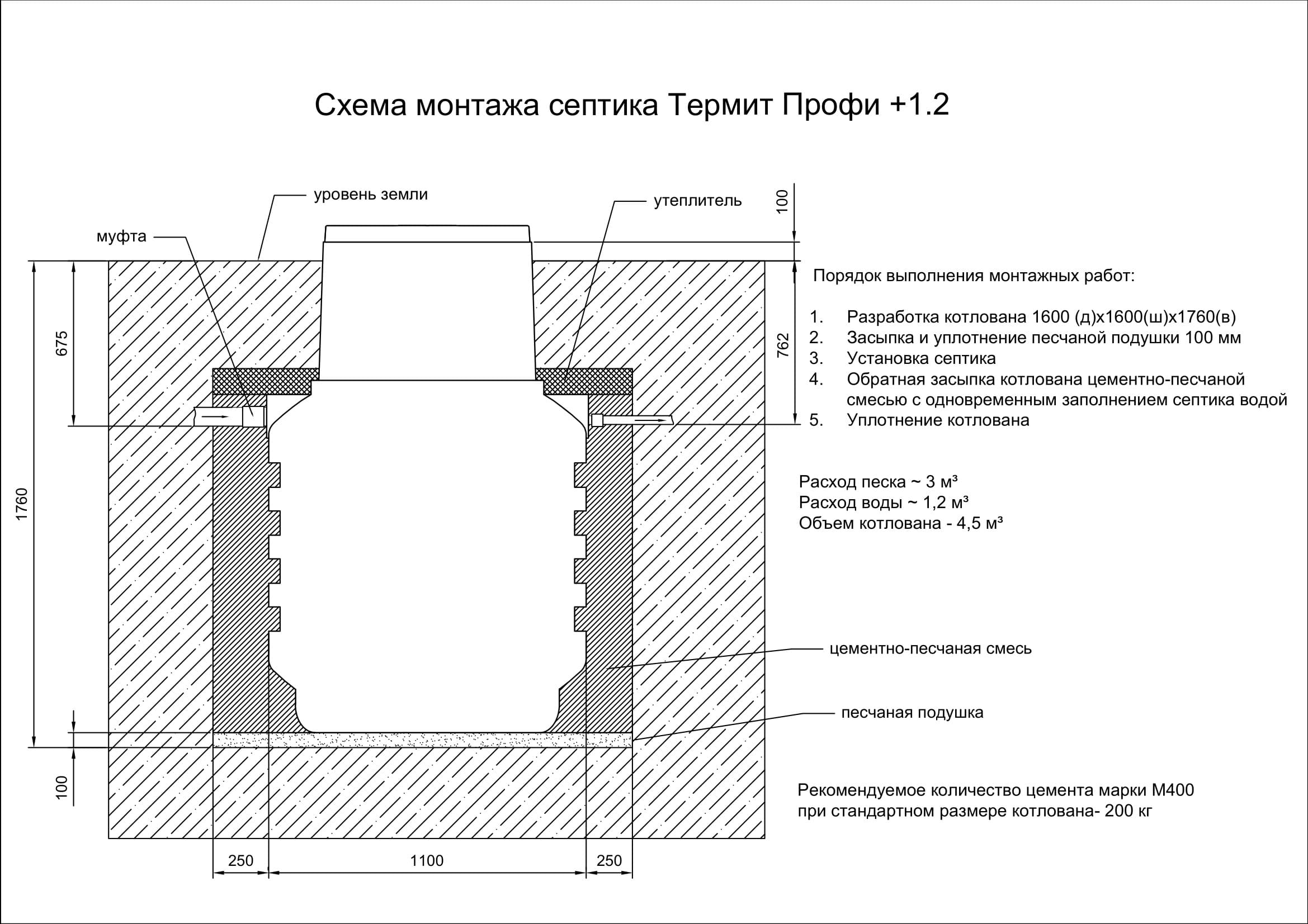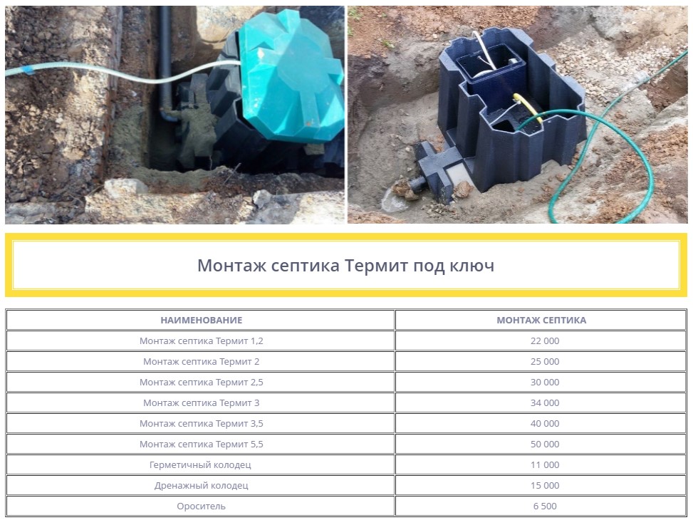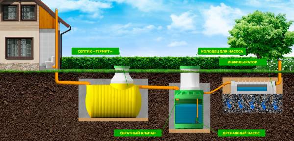 La gamme de modèles est assez large, le schéma d'installation de toutes les fosses septiques Termite est similaire, quel que soit le type.