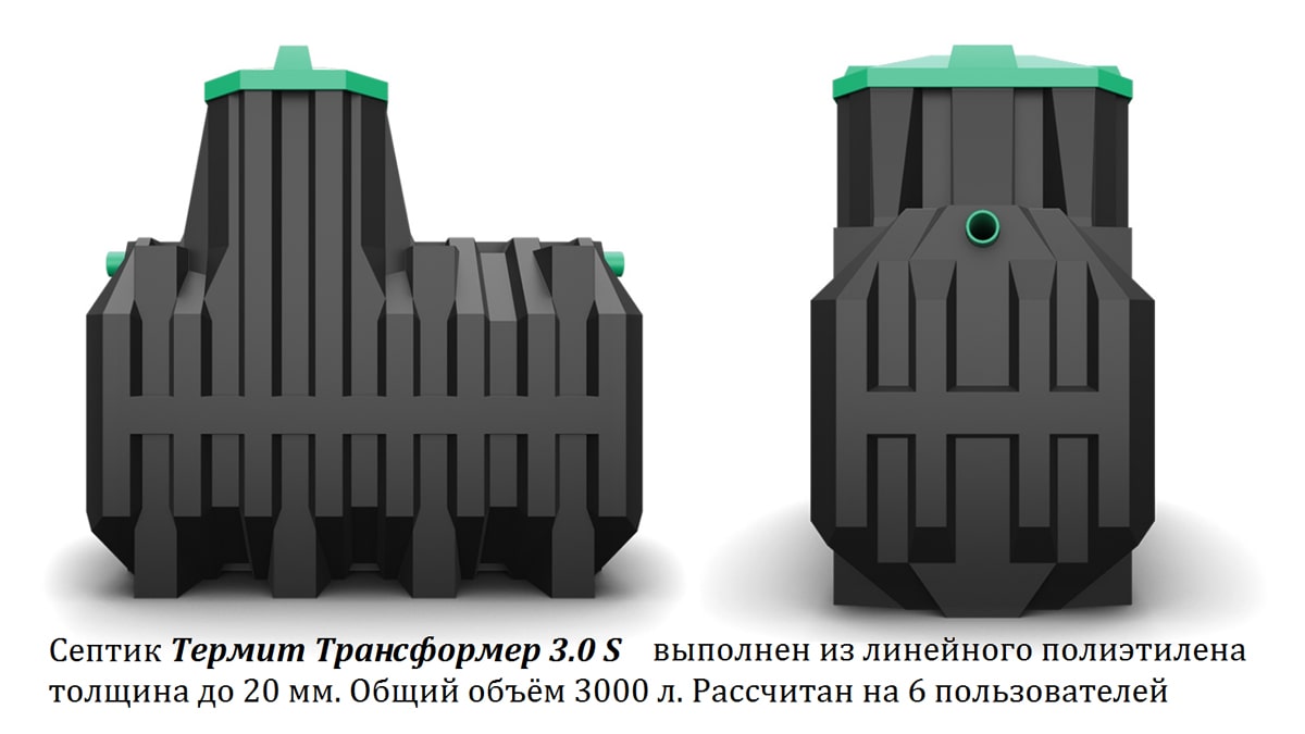 La fosse septique Termite Pro 3 comprend déjà 3 chambres, qui offrent un niveau supérieur de traitement des eaux usées. En général, l'installation a un volume de 3000 litres, ce qui est suffisant pour desservir 4 à 6 personnes, c'est-à-dire qu'elle est conçue pour une famille moyenne. L'épaisseur de paroi de Thermite est de 3-2 cm, ils sont en polyéthylène linéaire à haute résistance. La productivité de l'installation est de 1 à 1,2 m³ par jour. Fosse septique Termite transformateur 3 poids 185 kg, ce qui signifie qu'il vaut mieux confier son installation à une entreprise qualifiée disposant d'un parc de matériel spécialisé et de spécialistes.
