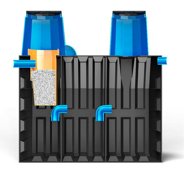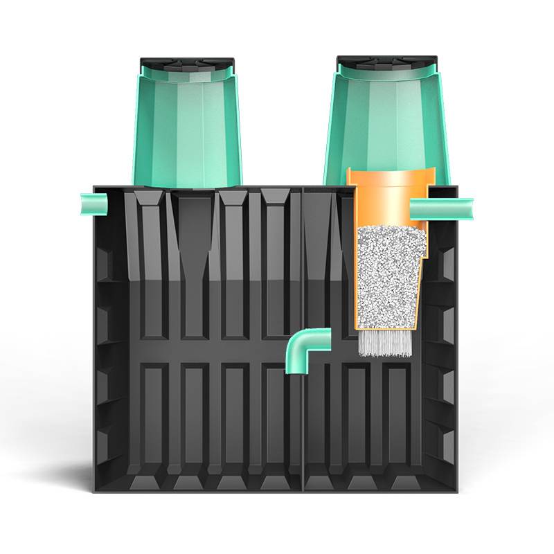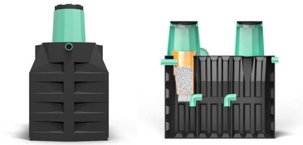 Cette série d'installations avec drainage gravitaire. L'intérieur du réservoir se compose de 3 compartiments. Le trop-plein du compartiment 1 vers le compartiment 2 est équipé d'un mécanisme de filtre à gros grains. La deuxième chambre est remplie de charge polymère pour créer des conditions confortables pour le fonctionnement des micro-organismes. A partir de la 3ème chambre, le liquide s'écoule par gravité dans l'arroseur pour la purification du sol.