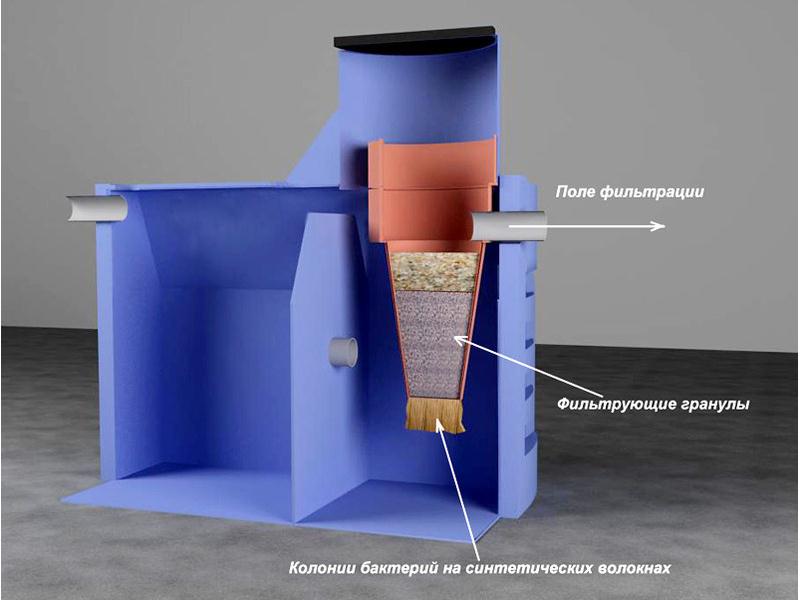 Le nettoyage y est effectué par des bactéries anaérobies situées sur des fibres synthétiques. Les fibres sont fixées sur la brosse, elles agissent donc directement sur l'eau, sans pompage supplémentaire à travers le filtre. À la sortie de cette section, une pompe est installée qui pompe le liquide dans le réservoir suivant avec un filtre granulaire. C'est la dernière étape de nettoyage. Ici, le liquide est complètement débarrassé des formations possibles et des odeurs désagréables. Le plus efficace est une fosse septique avec purification supplémentaire du sol, mais un tel filtre devra être acheté séparément.