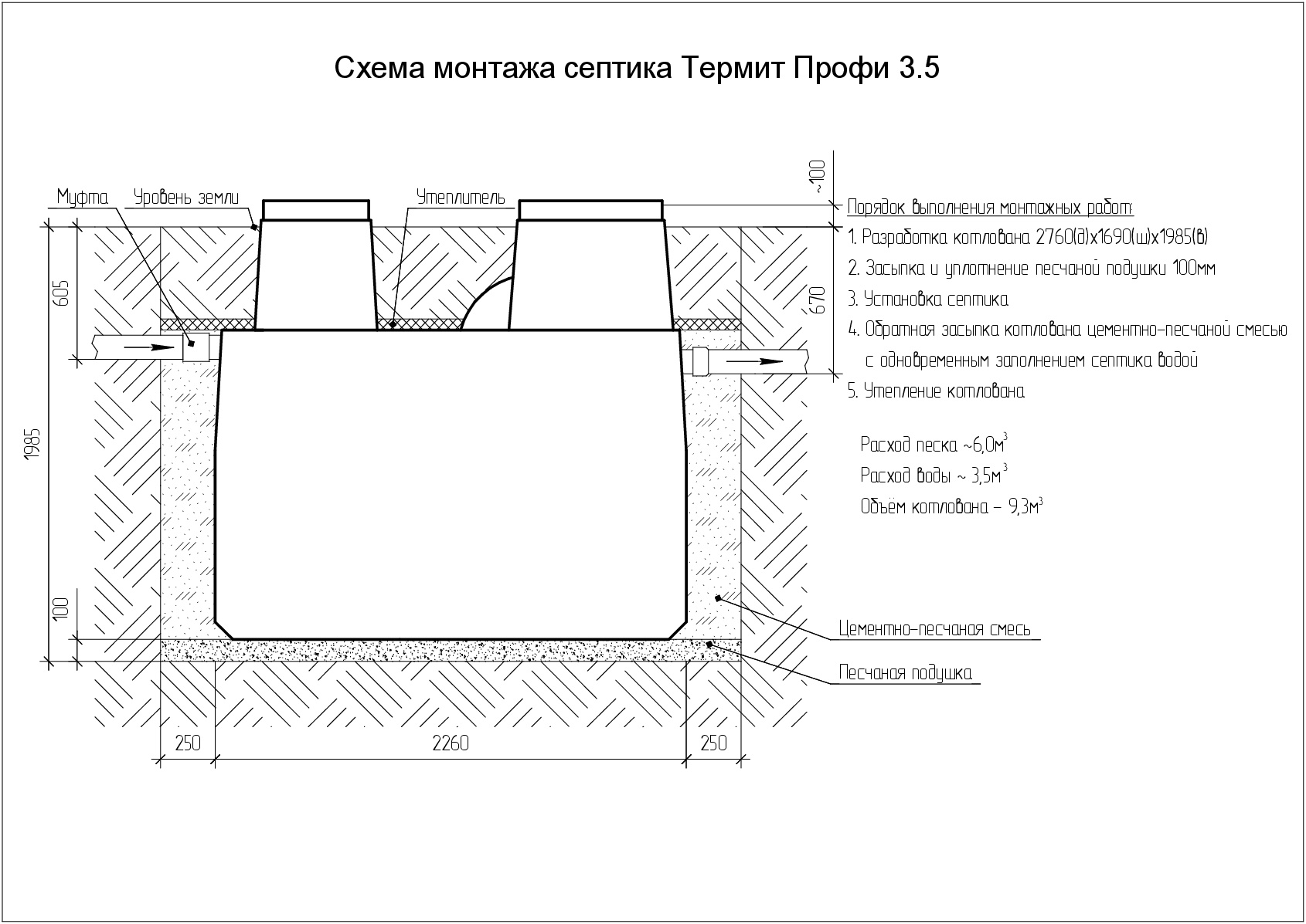 - En même temps, le système est rempli d'eau, principalement pour les tests, ainsi que pour protéger les parois de la cuve de la pression extérieure. La condition principale pour un travail de qualité est que le sable soit compacté tous les 20 cm.