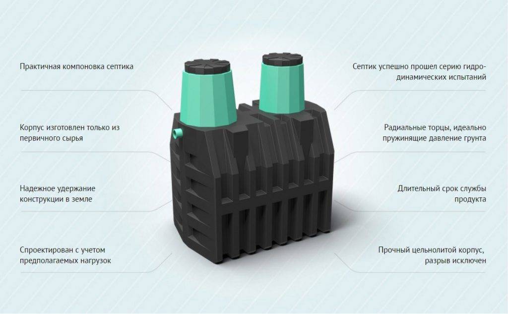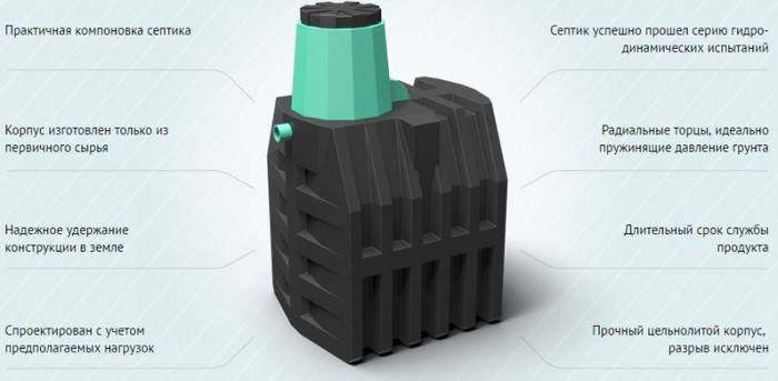 Le volume du réservoir est de 2500 litres, il a 2 chambres et est conçu pour servir 3 à 5 personnes. Chaque chambre du mécanisme de nettoyage est équipée d'un col. Le diamètre d'un compartiment est de 50 cm, à travers lequel les boues sont pompées. 2 chambres d'un diamètre de 65 cm, utilisées pour l'entretien spécial des filtres. Le rendement de la structure est de 1 m3/24 heures. L'épaisseur des parois du boîtier est de 20 mm, les dimensions sont de 1820x1155x2005 mm. Le poids du système sans mécanisme de filtrage est de 120 kg.