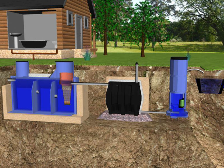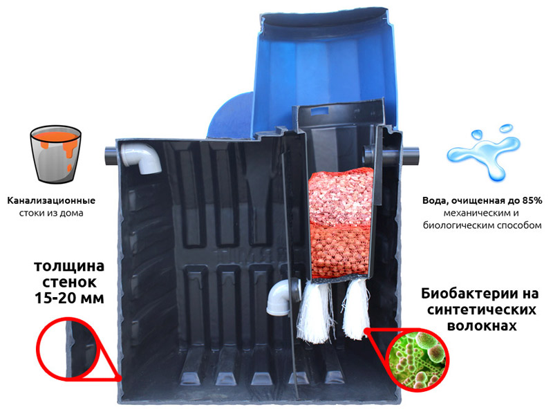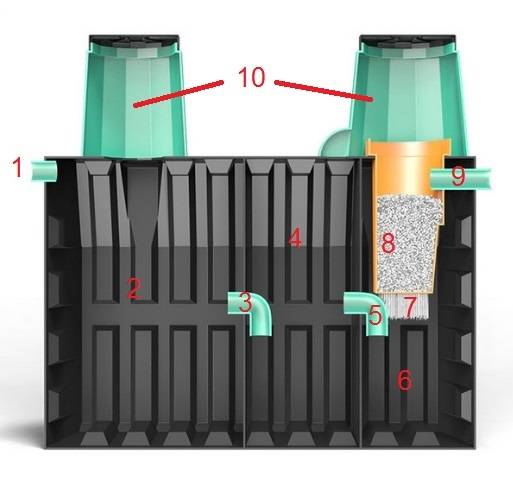 Une telle fosse septique n'a pas de pompes. Il n'a pas besoin d'électricité pour fonctionner. Tous les écoulements à l'intérieur et les sorties d'eau vers l'extérieur se font en mode gravitaire.