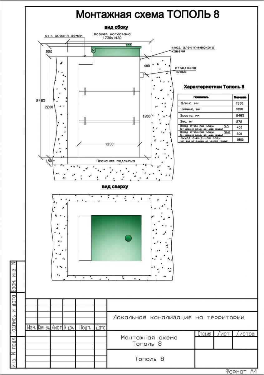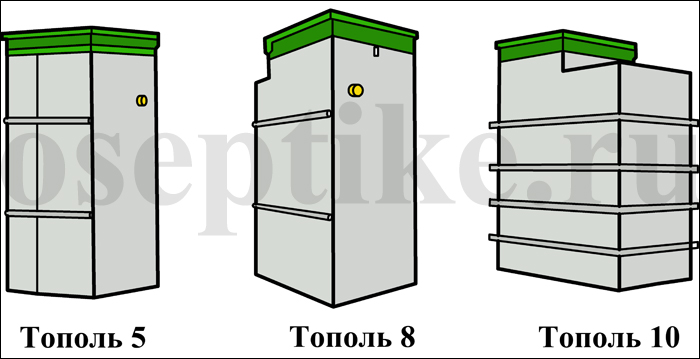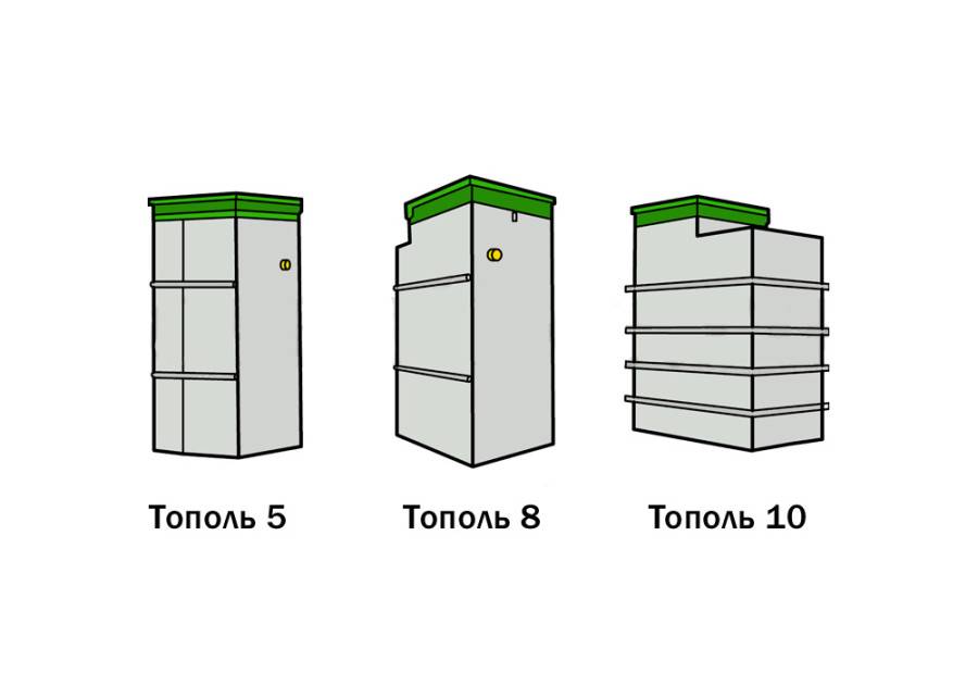 La fosse septique en peuplier est représentée par une gamme assez large de modèles. À titre d'exemple, on peut citer les fosses septiques des séries budgétaires Topol-8 et Topol-5, où le chiffre indique le nombre d'utilisateurs pour lesquels le modèle correspondant est fourni. Ils se caractérisent par une faible consommation d'énergie, allant de 1,4 à 2,8 kW par jour. La fosse septique est conçue pour le traitement des eaux usées domestiques et le volume quotidien moyen d'eaux usées par personne dans 200 litres sert de base pour déterminer ses performances.