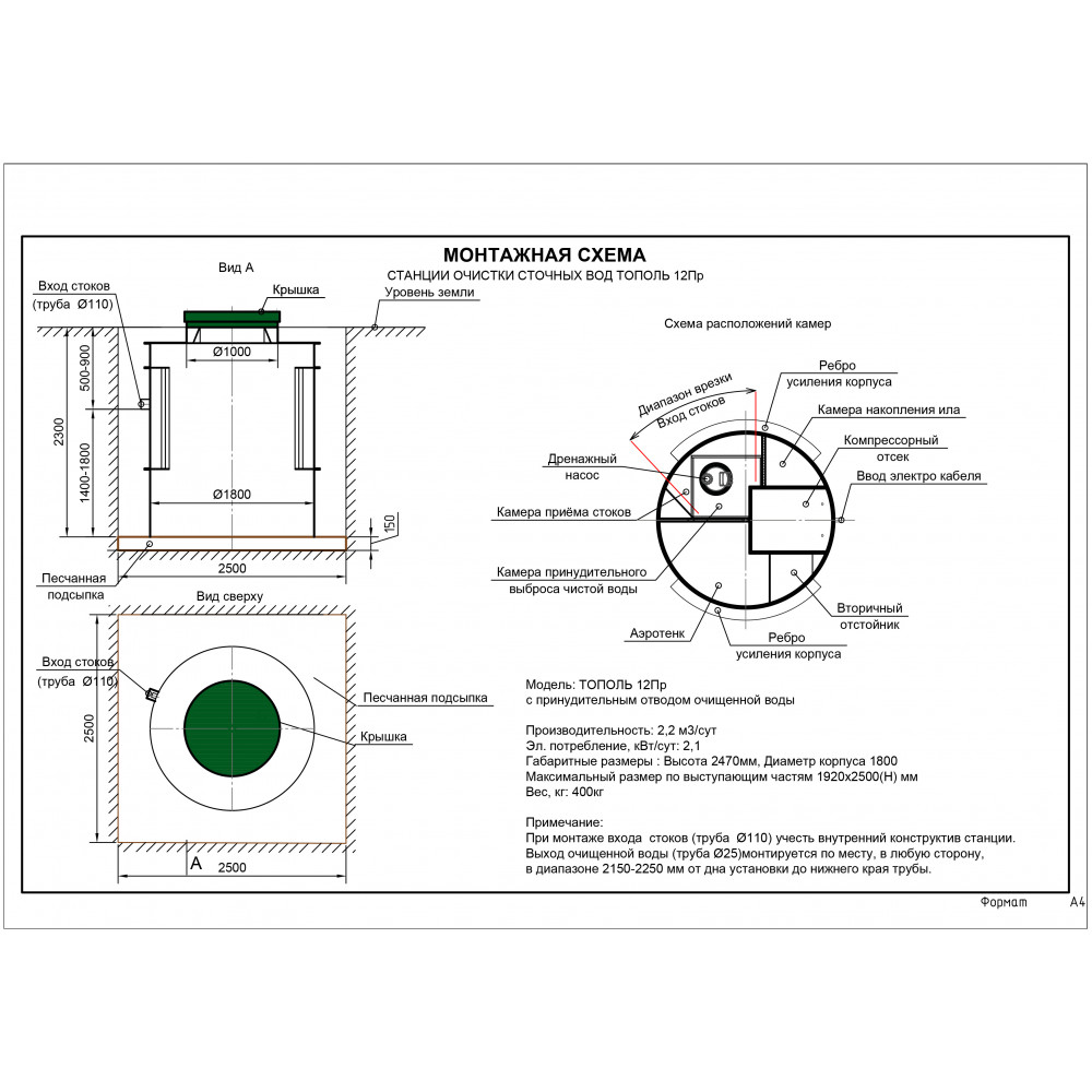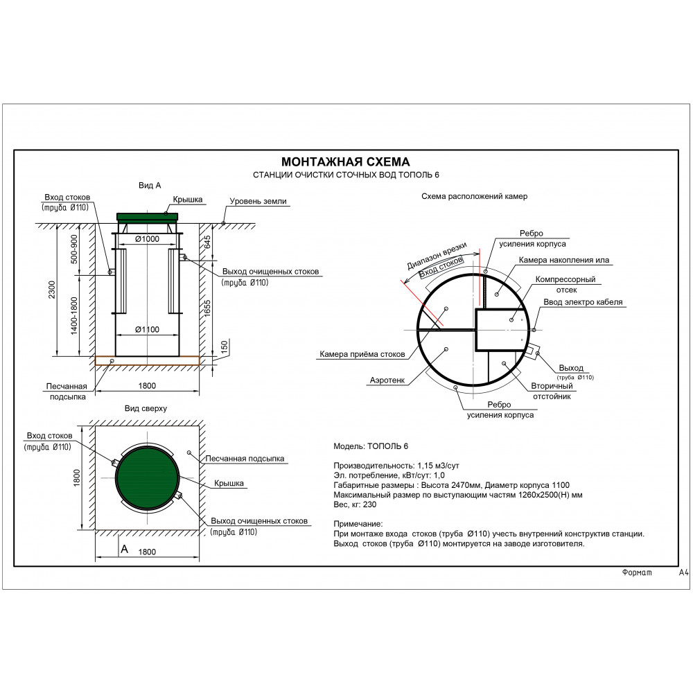 La fosse septique en peuplier est un conteneur carré en polypropylène dont la cavité interne est divisée en quatre compartiments au moyen de cloisons. Topol dispose de quatre ponts aériens qui assurent le pompage séquentiel des eaux usées conformément à la chaîne technologique de traitement des eaux usées. L'air est fourni à deux chambres de travail d'une fosse septique sans pompage à l'aide d'aérateurs. L'air pour les aérateurs et les ponts aériens est fourni par des compresseurs situés dans le compartiment des instruments. La housse étanche est équipée d'un déflecteur d'air.