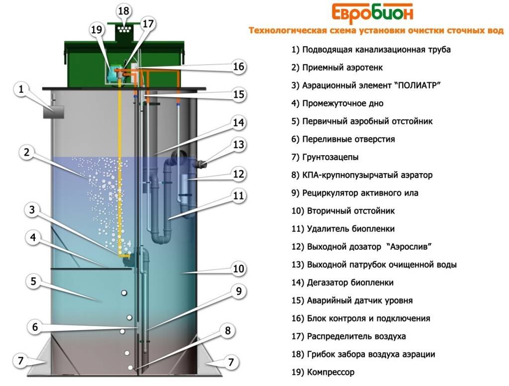 Comme déjà mentionné, l'appareil est divisé en quatre sections principales. Tout d'abord, les effluents pénètrent dans la chambre de réception, où ils sont intensément saturés d'air et entrent en contact avec des cultures bactériennes.