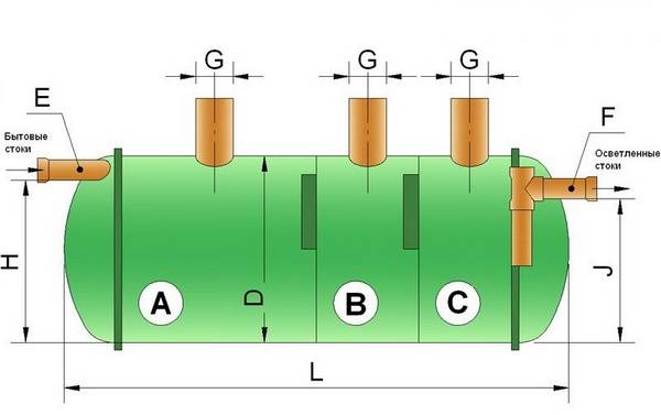Le limon et l'eau sont des produits de décomposition sous l'influence de bactéries anaérobies. Le nombre de chambres dépend du volume de déchets ménagers liquides entrant dans la fosse septique. Habituellement, les fosses septiques pour une maison privée sont faites avec une division en compartiments de 2 à 3 chambres.