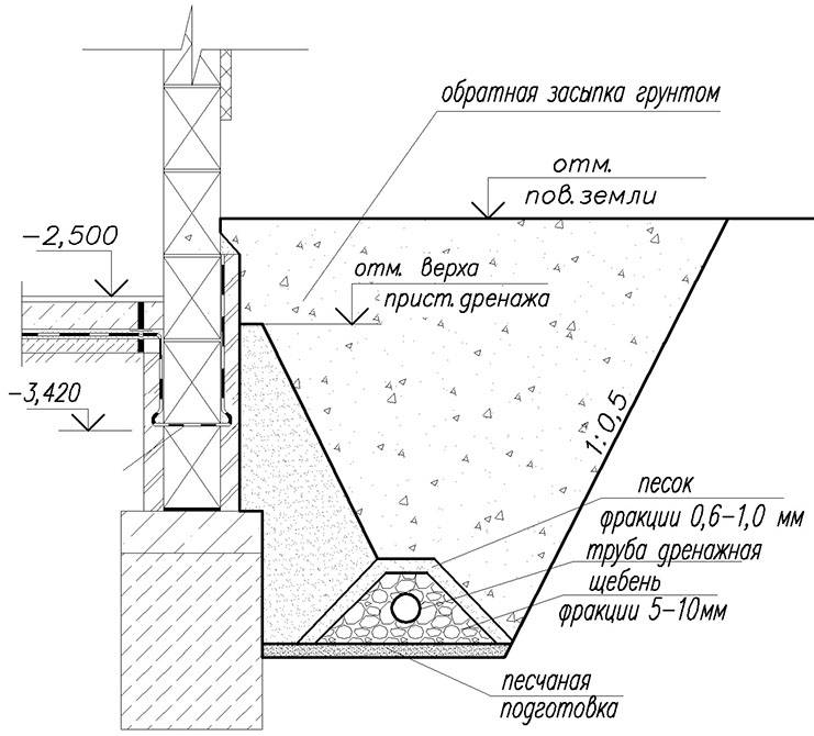 - profondeur de pose du drainage mural - 30-50 cm sous la base de la fondation;