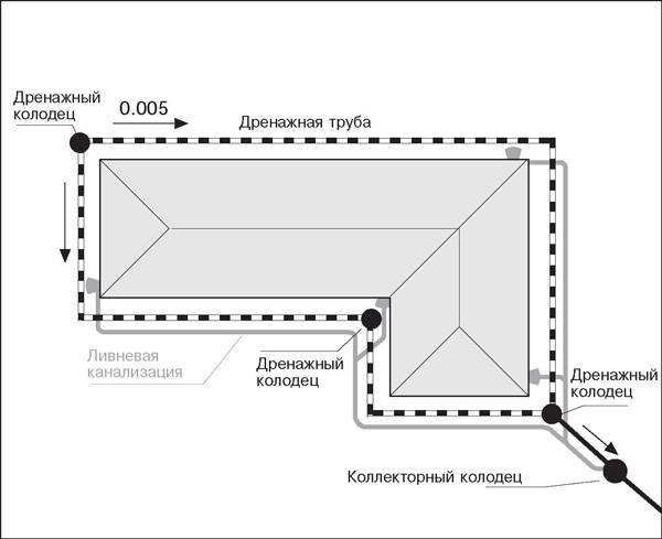 Le but de ce système de drainage du sol est d'éliminer l'eau du sol, de pluie ou de fonte de la fondation et d'empêcher l'eau souterraine de monter lors de la fonte des neiges ou de fortes pluies. Il s'agit d'un circuit fermé de tuyaux ou de gouttières perforés (perforés) avec le côté convexe vers le haut, posés à une profondeur d'un à un mètre et demi.