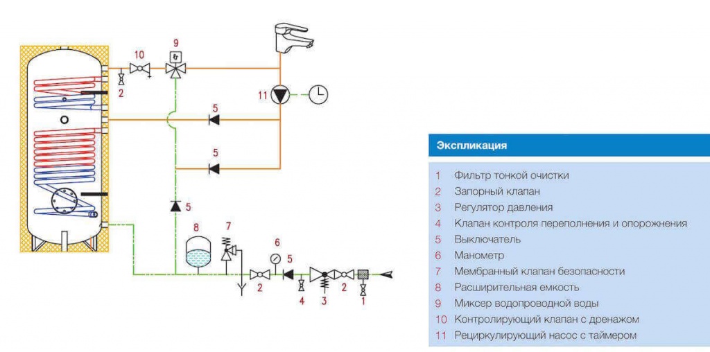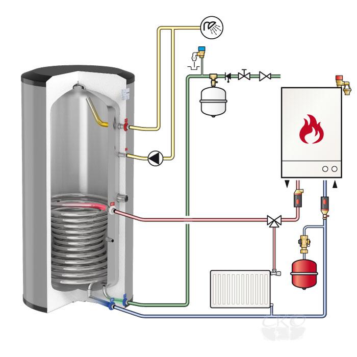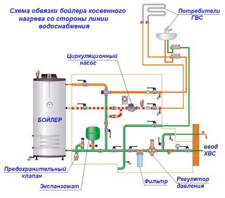 Lors du choix d'un schéma de raccordement pour une chaudière indirecte pour le chauffage de l'eau, l'emplacement de l'appareil dans la maison, ainsi que les caractéristiques du câblage du système de chauffage, sont pris en compte.