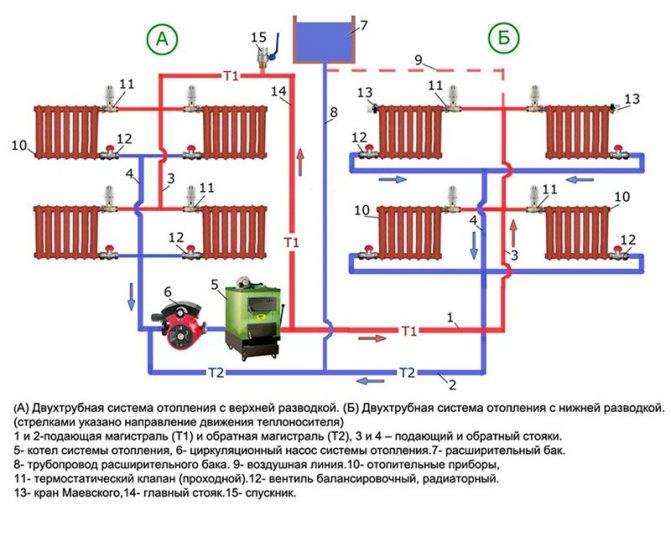 Lors de l'installation d'un système de chauffage vertical à deux tubes, le schéma de câblage de chauffage inférieur et supérieur de la chaudière est applicable. Maintenant plus en détail sur chacun d'eux.