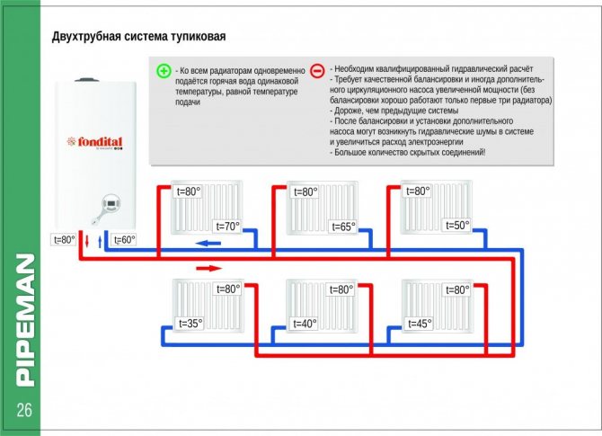 Étant donné que chaque unité de chauffage a deux tuyaux, l'eau chaude circule dans l'un et est déjà refroidie dans l'autre. Ce système diffère également d'un système monotube en ce qu'il a une procédure différente pour connecter les appareils de chauffage. Les experts recommandent d'installer un réservoir de réglage devant chaque radiateur.