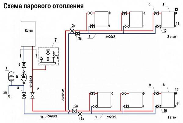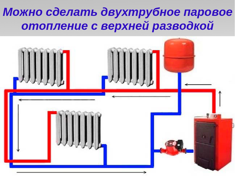 1. manière supérieure. Cela implique l'installation d'une conduite de vapeur au-dessus du dispositif de chauffage. Les tuyaux sont abaissés de la chaudière aux batteries et les systèmes de condensat sont posés au sol.