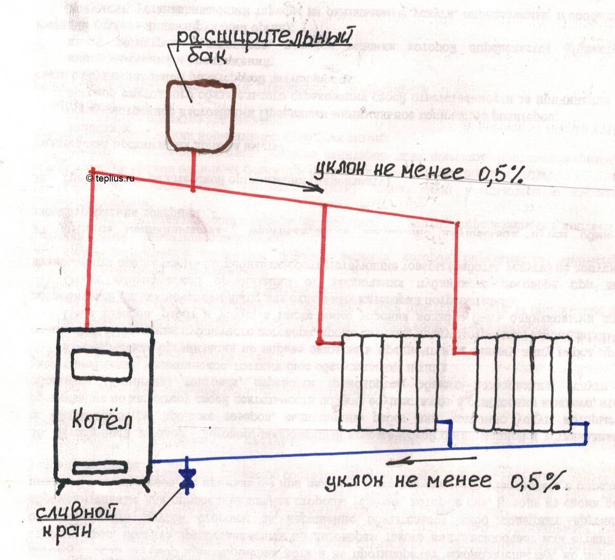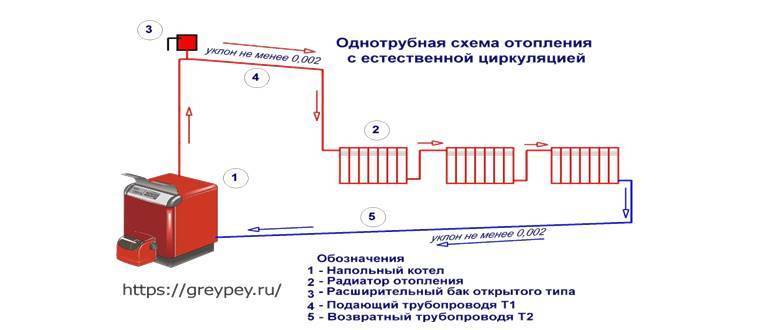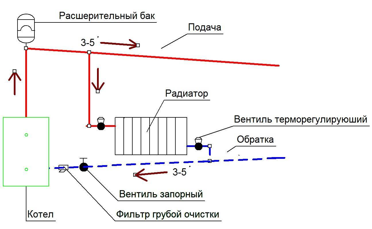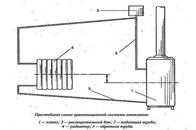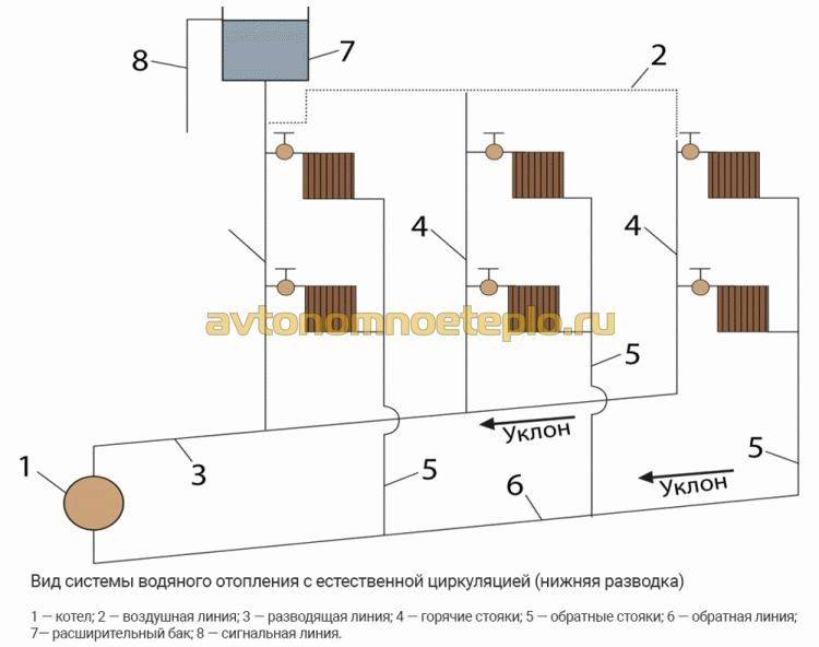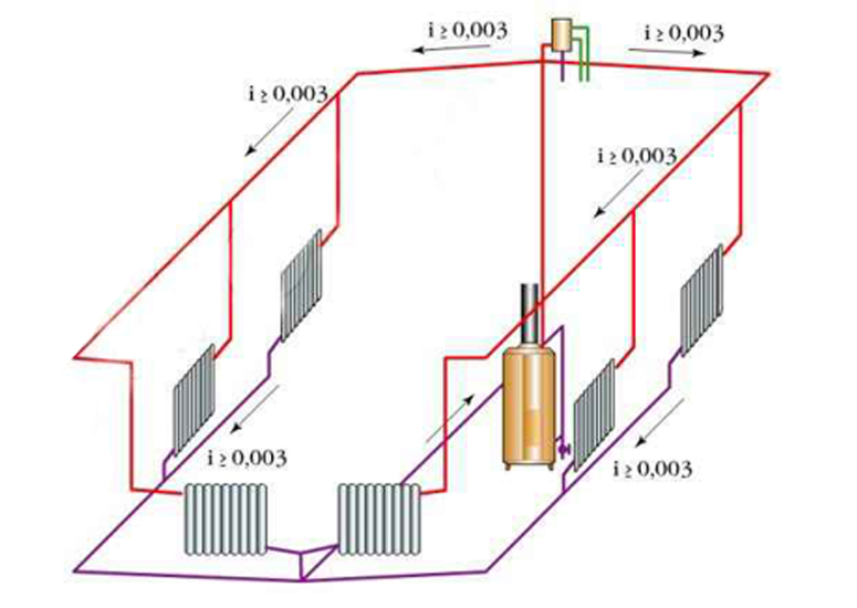 Ici, l'eau se déplace à travers le pipeline sans aucune contrainte d'appareils mécaniques. Cet effet n'est obtenu que par l'installation correcte de tous les composants de la conduite de chauffage - tous les tuyaux doivent être situés à un certain angle d'inclinaison. Sinon, le système ne fonctionnera pas.