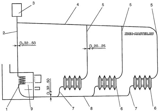 • Maintenant l'installation du pipeline. Le point de départ du raccordement est le générateur de vapeur, puis la canalisation est amenée à la première structure de chauffage, puis au raccordement des sorties et des entrées. Tous les tuyaux suivants sont connectés de la même manière. La connexion au réseau principal est réalisée avec une pente de 3 mm par 1 m - cela est nécessaire pour la circulation naturelle du liquide de refroidissement.
