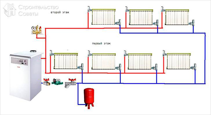 Pour le bon fonctionnement du système dans une maison à plusieurs étages, une pompe séparée à faible puissance est installée à chaque niveau ou une pompe à haute puissance est connectée au collecteur.