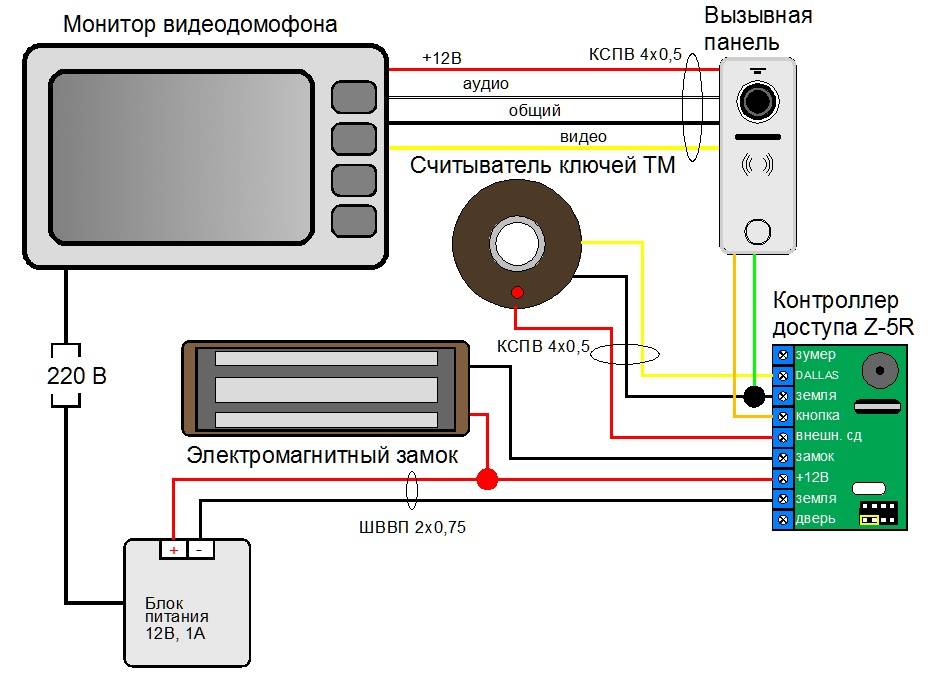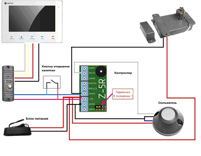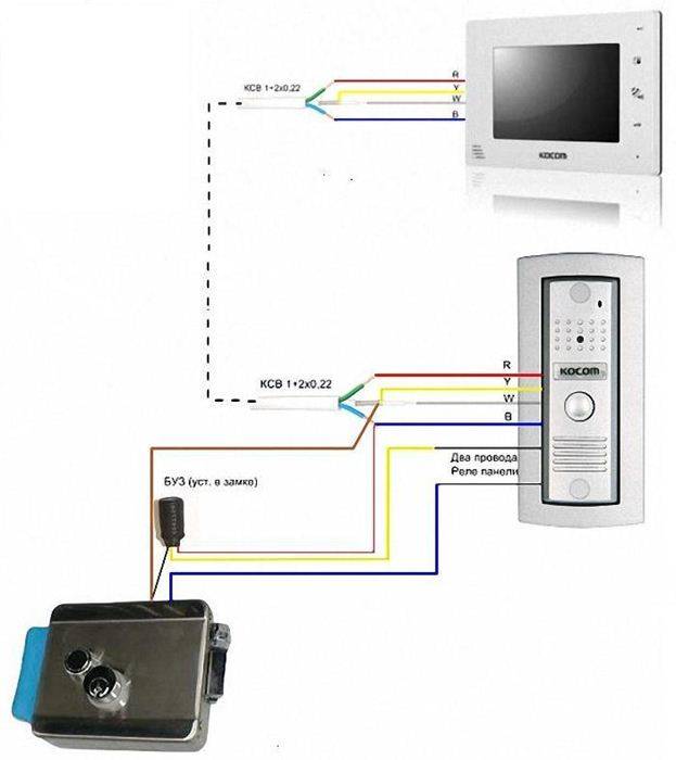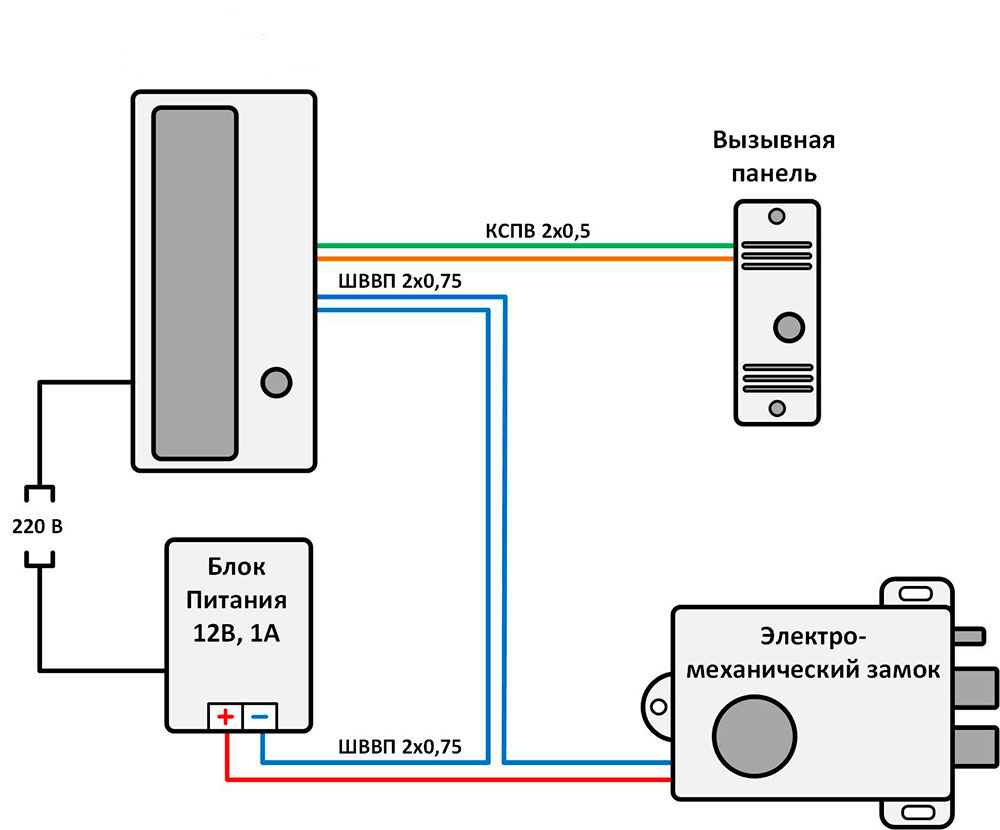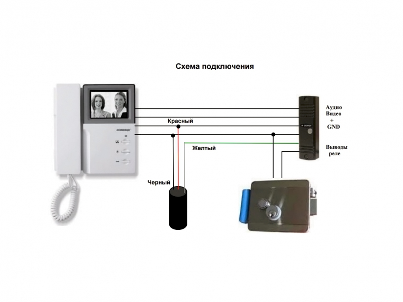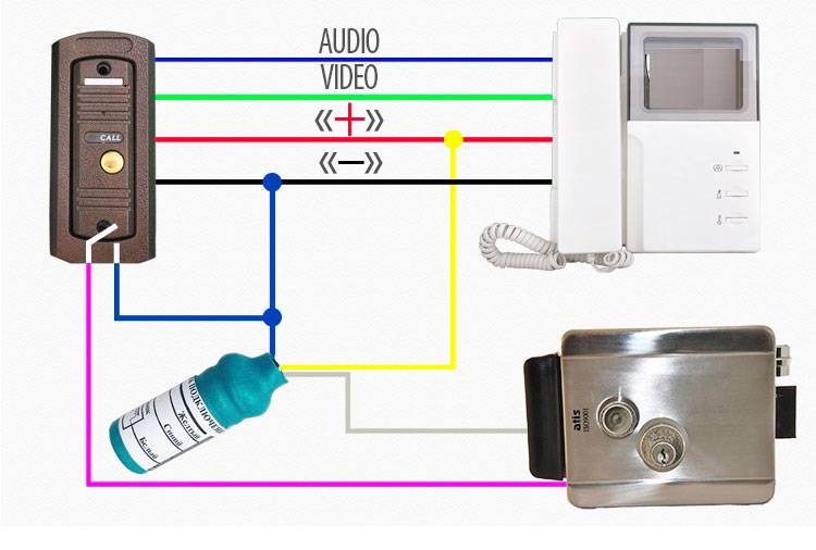 1 étape. Il est nécessaire de connecter tous les éléments du système d'interphone vidéo avec un panneau vidéo, une serrure électromagnétique et un contrôleur :