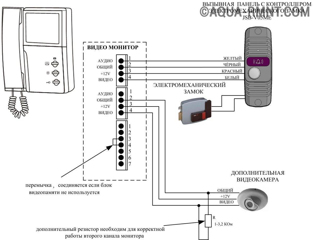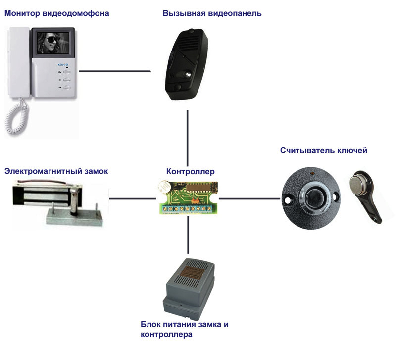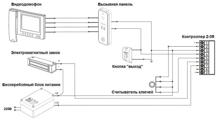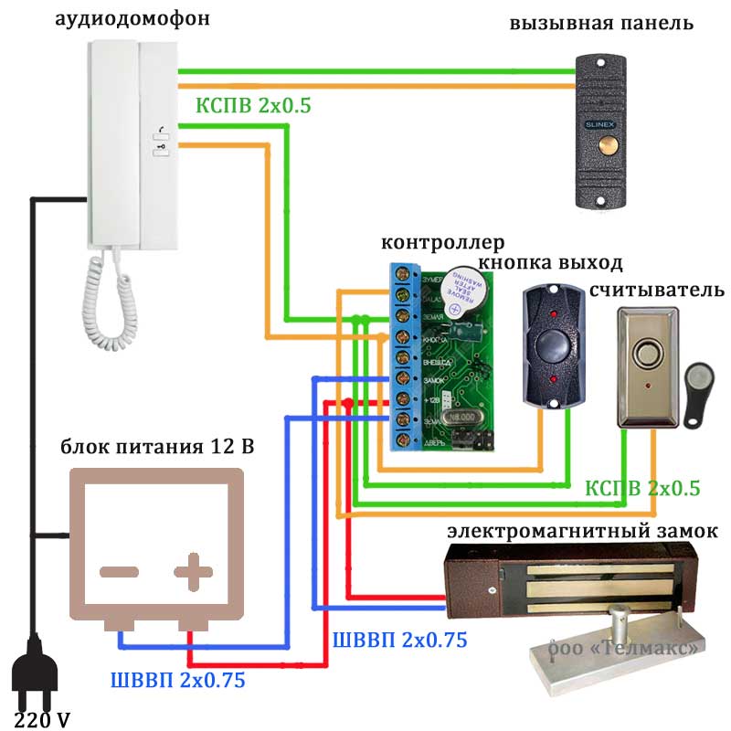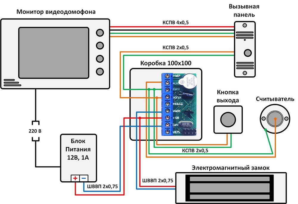 1 étape. Il est nécessaire de connecter tous les éléments du système d'interphone vidéo avec un panneau vidéo, une serrure électromagnétique et un contrôleur :