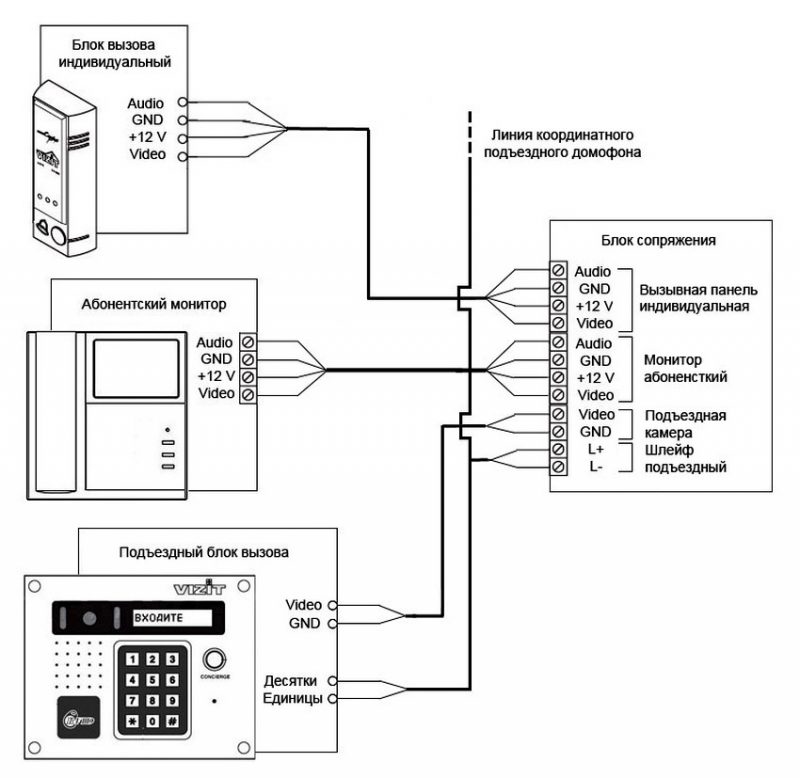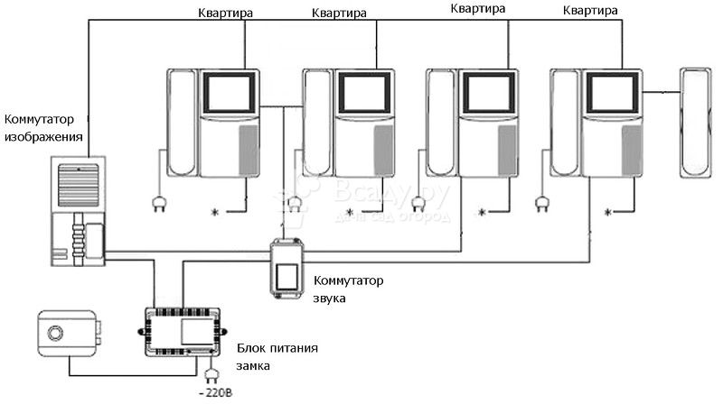 On peut voir sur la figure que dans la version multi-utilisateurs du système d'interphone, il existe des commutateurs supplémentaires qui dirigent le signal vers l'appartement requis. De plus, le câblage est réalisé avec un câble multiconducteur dont le nombre de conducteurs correspond au nombre d'abonnés connectés. Les signaux audio et vidéo passent par des fils séparés, ce qui complique encore la connexion de tous les éléments. Les systèmes plus avancés utilisent des systèmes de multiplexage ou un format de communication numérique, ce qui nécessite des qualifications assez élevées de la part des installateurs.