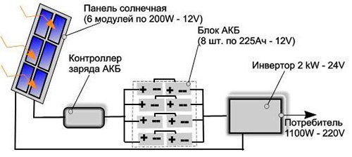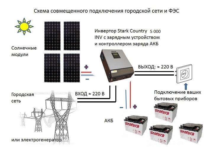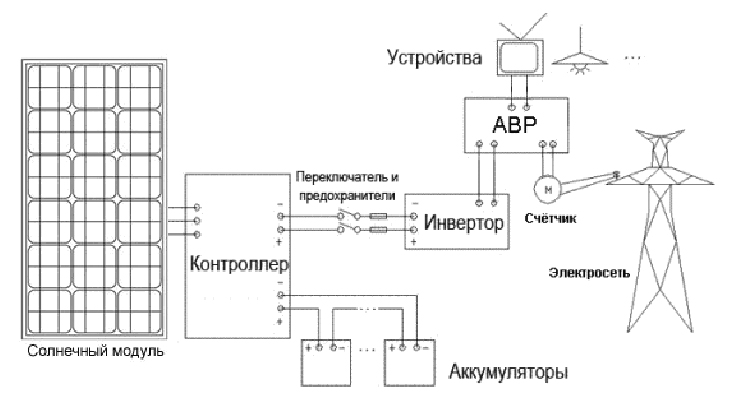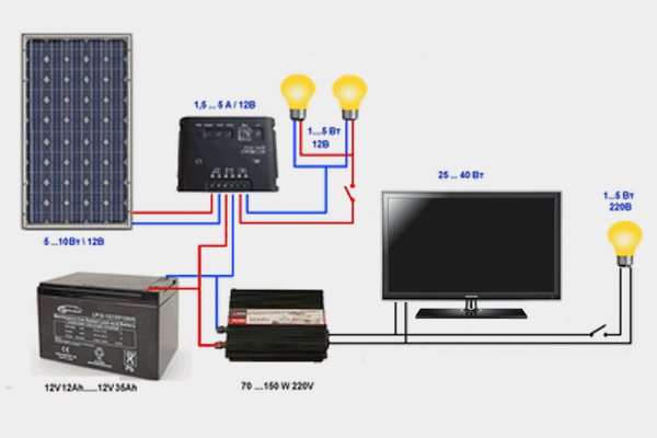 Comme vous pouvez le voir, ce schéma est considéré comme assez simple. Presque n'importe qui peut le faire. Lors de la connexion de la structure, vous devrez respecter la polarité. Si vous souhaitez utiliser l'énergie solaire et un réseau fixe chez vous, le schéma de connexion du panneau solaire ressemblera à ceci :