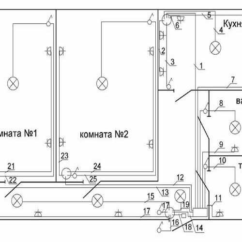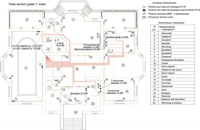 Le schéma de câblage de la maison indique l'emplacement des fils électriques, des nœuds de montage, des connecteurs d'alimentation. La cuisine, la salle de bain sont considérées comme énergivores, le salon, l'atelier sont assez spacieux. Les locaux économiques comprennent les enfants, les chambres, les salles de bains, les buanderies.