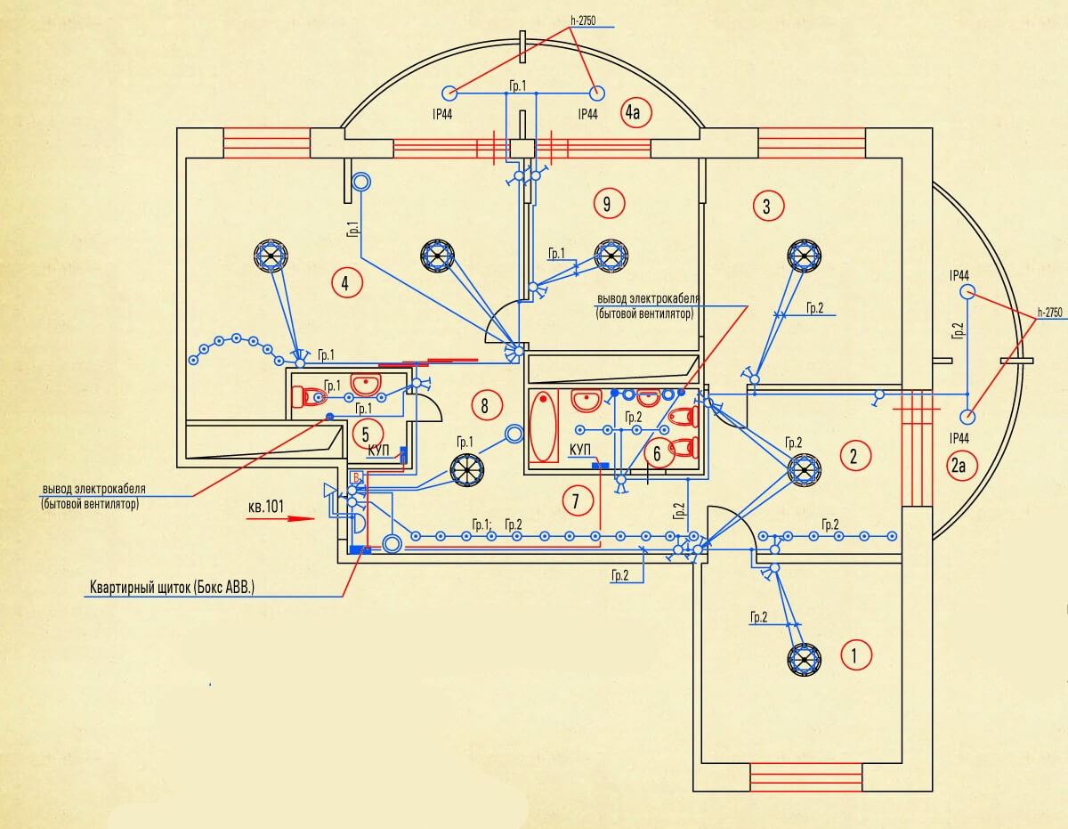Toutes les connexions sont scellées. Le câblage exposé ne doit pas entrer en contact avec les murs et les plafonds. Il peut être monté à l'aide d'isolateurs en porcelaine. Le câblage caché est effectué à travers des tuyaux métalliques (cuivre), des boîtes en acier sans faute avec mise à la terre.