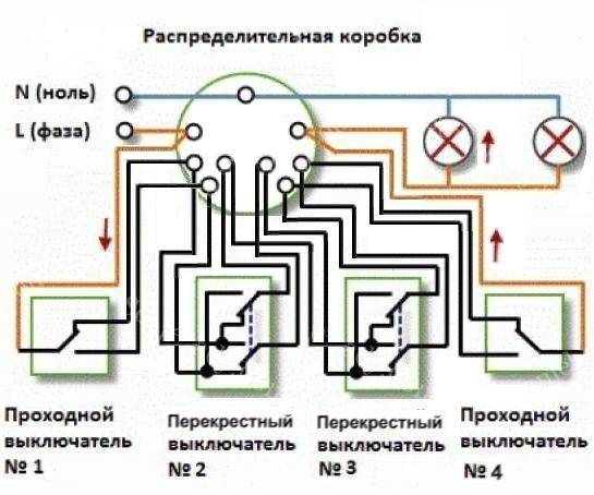 - les contacts du dernier interrupteur croisé sont connectés aux appareils d'éclairage via la boîte de jonction.