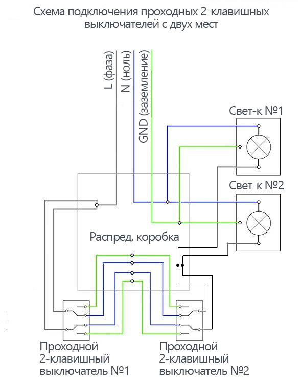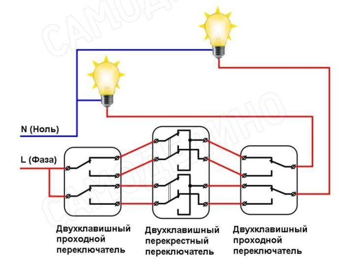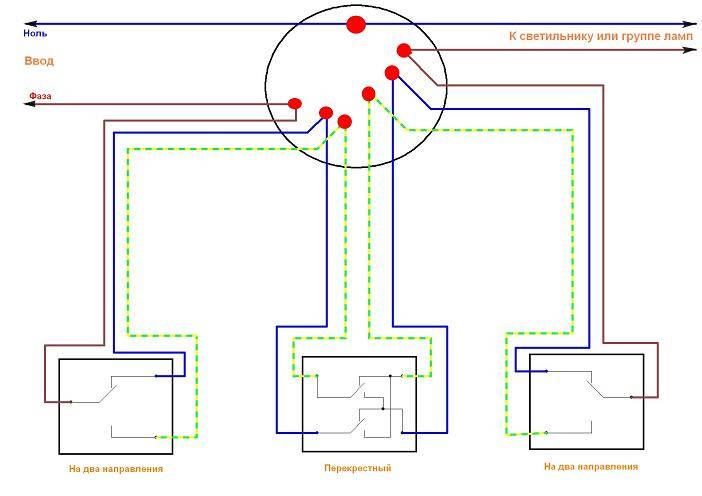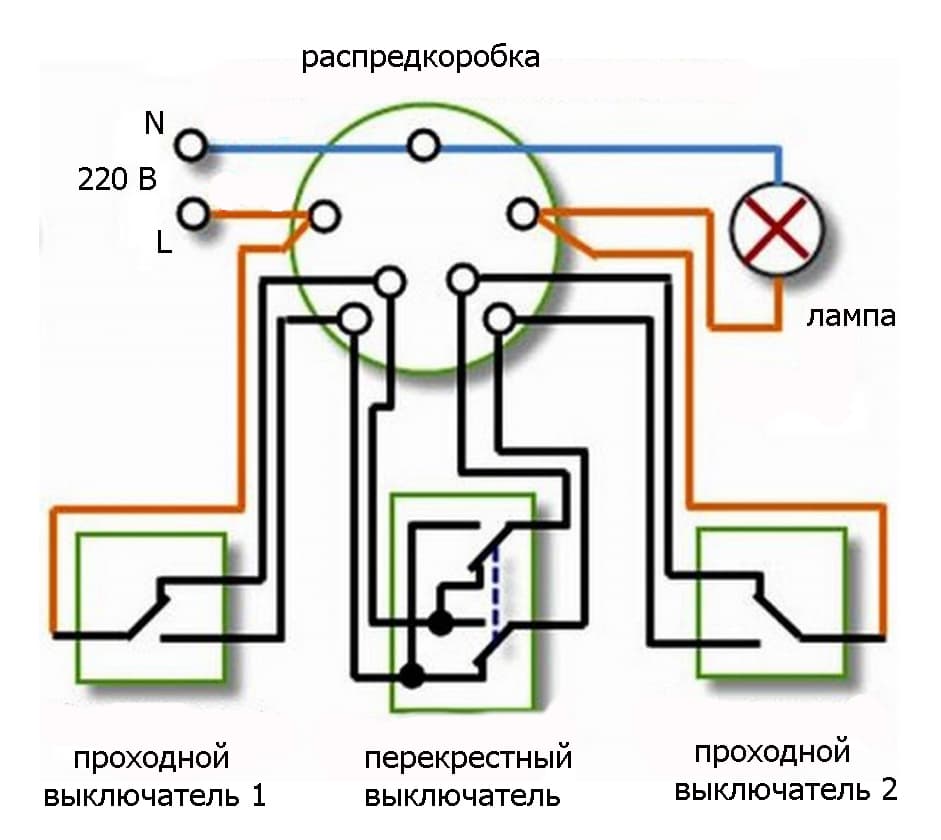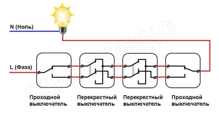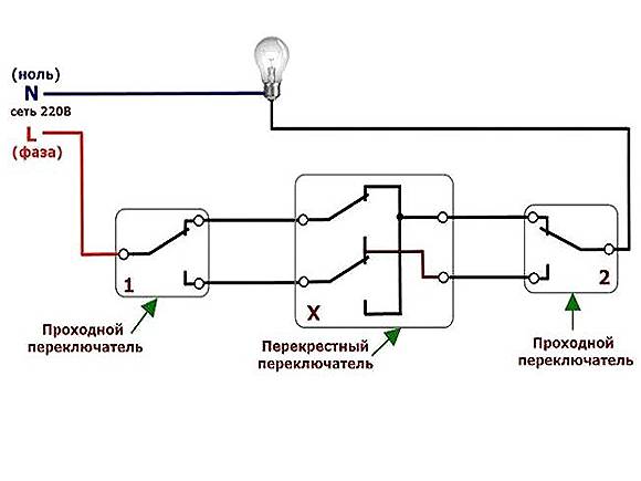 Dans ce schéma, la lampe est connectée avec un fil au fil neutre du réseau, le second au fil commun du premier interrupteur de passage. Deux fils du commutateur de premier passage sont connectés à une paire de contacts sur la croix. Les deux contacts libres restants sont connectés au deuxième interrupteur d'intercommunication. Le dernier contact du deuxième interrupteur de traversée est connecté au fil de phase.