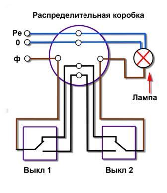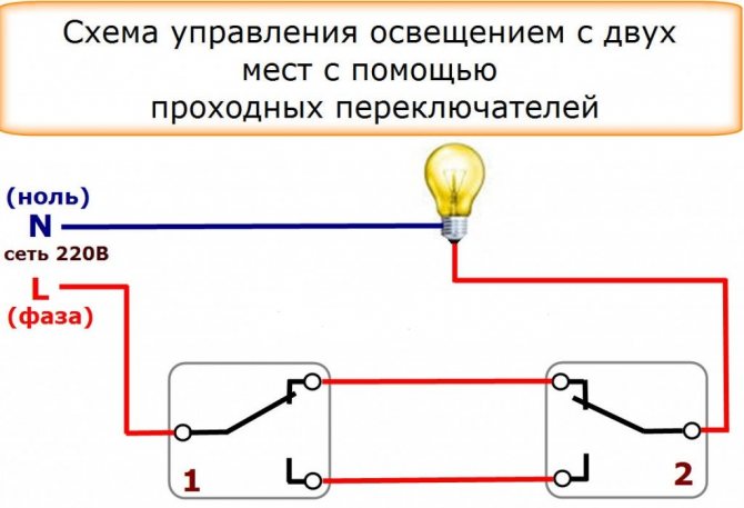 Si nous parlons d'un commutateur d'intercommunication, un schéma de connexion à 2 points est l'option la plus simple. Il s'agit du nombre minimum d'appareils pouvant être connectés au système pour que l'utilisateur puisse allumer ou éteindre une lampe. Sinon, ce sera un interrupteur normal.