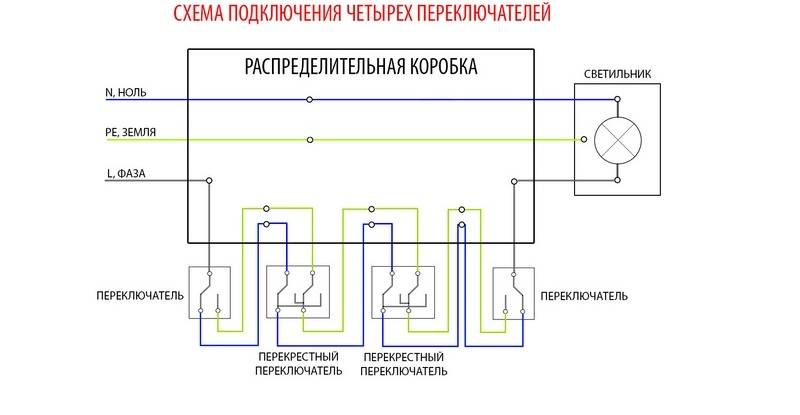 Si la surface de la pièce est suffisamment grande, deux ou trois interrupteurs peuvent ne pas suffire. Vous devrez parcourir une longue distance à chaque fois pour allumer ou éteindre les lumières. Dans ce cas, il sera possible d'utiliser le schéma de raccordement de l'interrupteur 4 points. Dans ce cas, deux dispositifs croisés supplémentaires sont introduits dans le système.