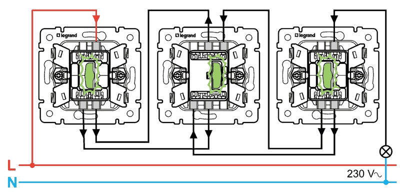 À l'aide d'interrupteurs de passage (interrupteurs de fin de course à 3 broches), il est possible de décider de l'activation et de la désactivation uniquement pour deux postes (emplacements). Et si vous avez besoin de plus de deux bornes marche/arrêt, vous avez besoin de : interrupteurs croisés ou intermédiaires (au moins 4 broches, interrupteurs).