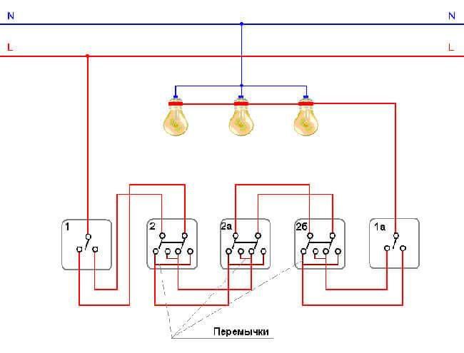 Sinon, en termes de méthode d'installation et d'équipement, ce schéma n'est pas très différent du précédent. Cependant, plus de câblage devra être posé ici.Par conséquent, afin de réduire le coût d'achat des fils, il est recommandé de connecter le conducteur d'alimentation au premier interrupteur de la chaîne avec un cavalier. Après tout, sinon, vous devrez poser des conducteurs séparés du boîtier de distribution.