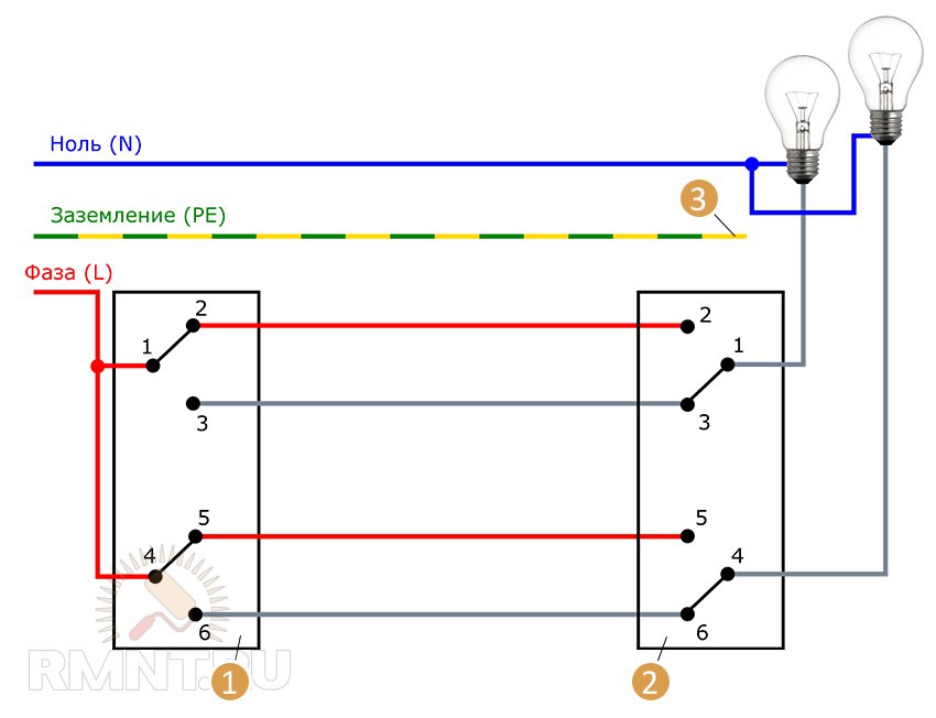 Le contact commun peut être situé n'importe où, il est donc important de le trouver, en se concentrant sur le diagramme ou les lectures de l'instrument. Très souvent, de tels problèmes surviennent lors de l'installation ou du remplacement de commutateurs pass-through de différents fabricants. Nous avons regardé les informations une par une, les avons connectées correctement, et la seconde s'est avérée provenir d'un autre fabricant
