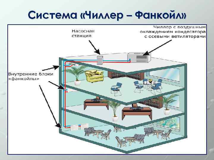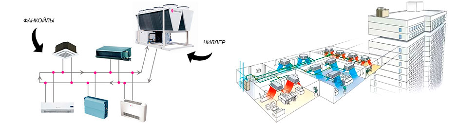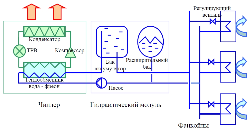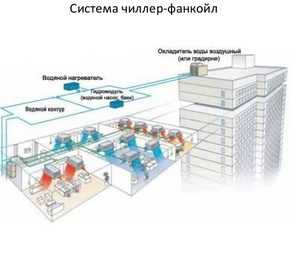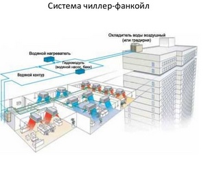 Système refroidisseur-ventilo-convecteur - un système de climatisation centralisé multi-zones dans lequel le fluide caloporteur entre la machine de refroidissement centrale (chiller) et les échangeurs de chaleur locaux (groupes aéroréfrigérants, ventilo-convecteurs) est un liquide refroidi circulant sous une pression relativement basse - eau ordinaire (en zone tropicale climats) ou une solution aqueuse d'éthylène glycol (dans les climats tempérés et froids). En plus du ou des refroidisseurs et des ventilo-convecteurs, le système comprend une tuyauterie entre eux, une station de pompage (module hydraulique) et un sous-système de contrôle automatique.