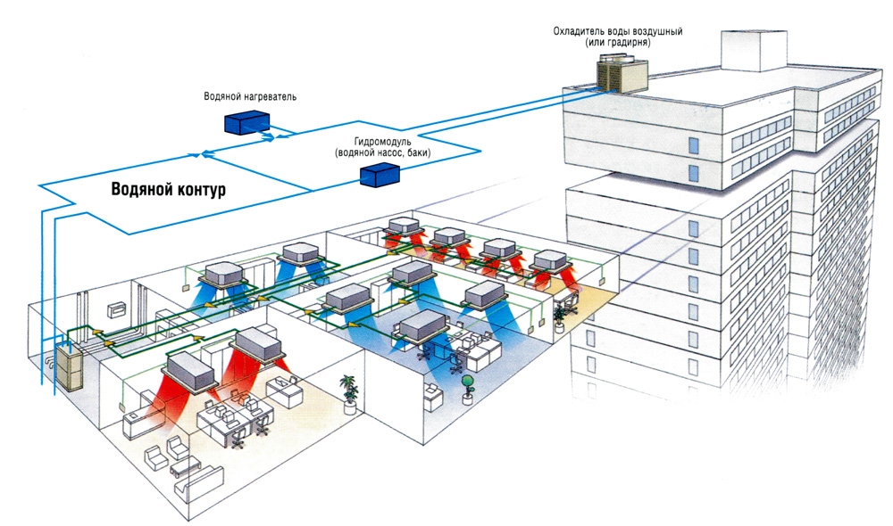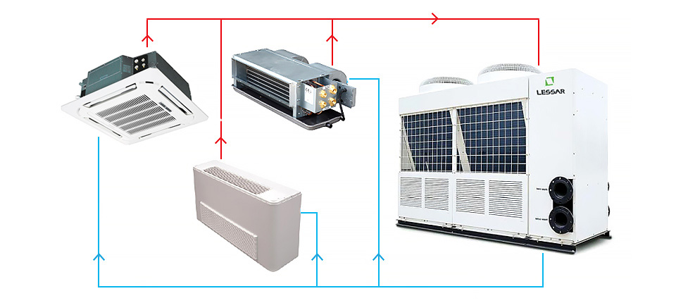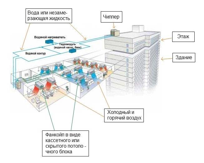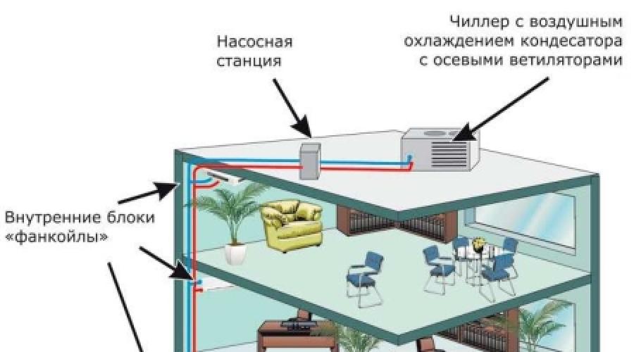 Simplifié, ce système de climatisation ressemble à ceci : son unité externe est une machine de refroidissement par eau, appelée refroidisseur, reliée par une canalisation à un échangeur de chaleur interne - un ventilo-convecteur, qui est soufflé par un ventilateur.