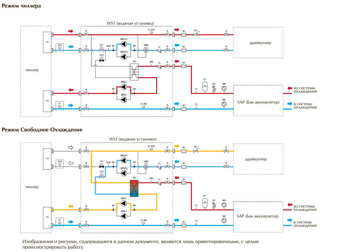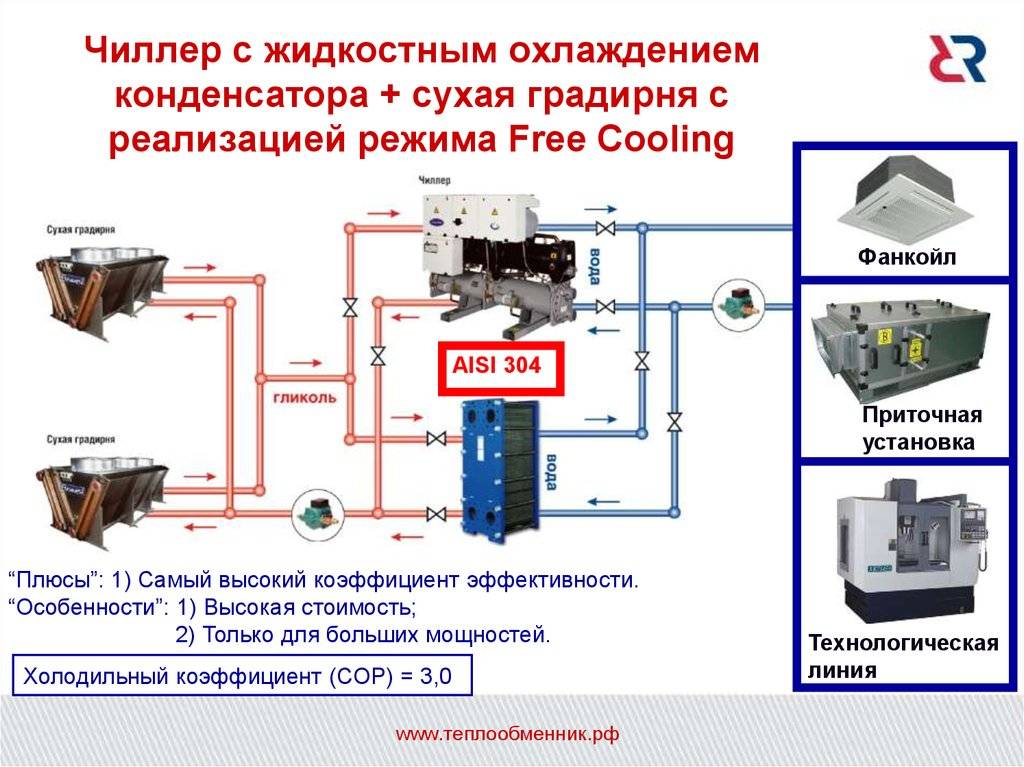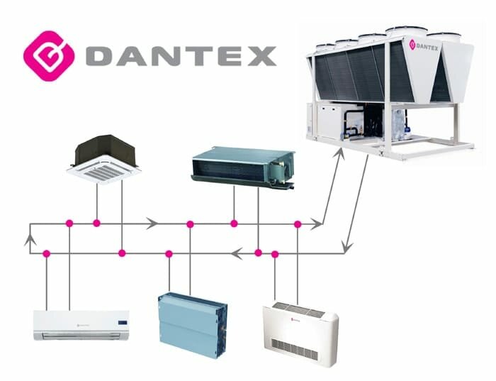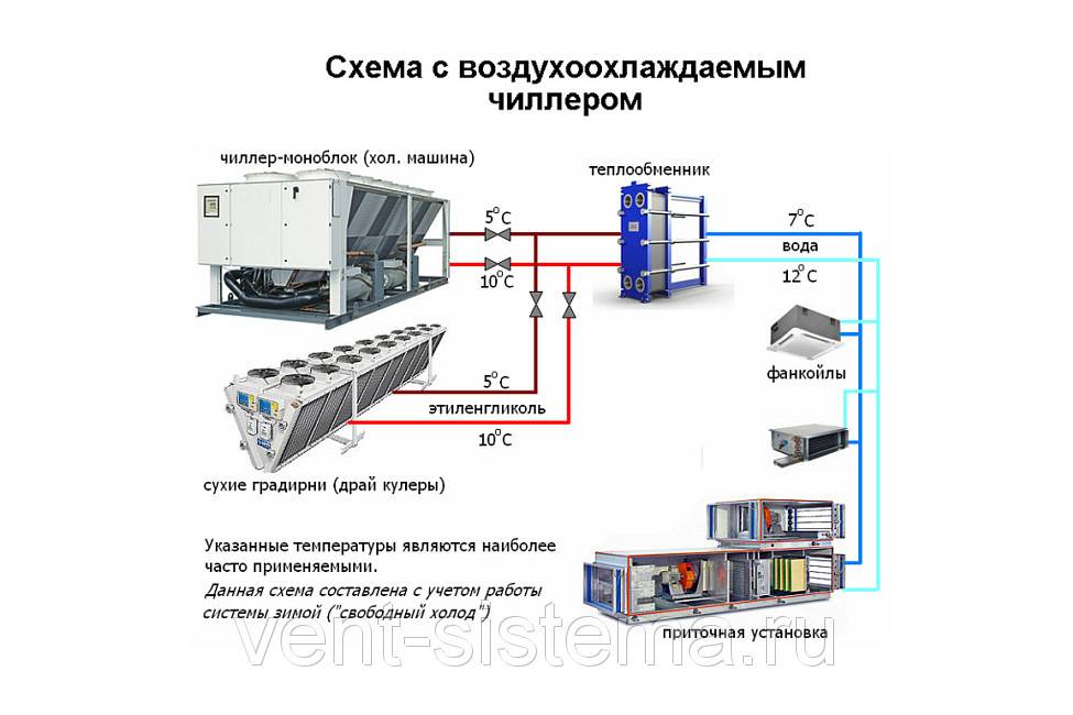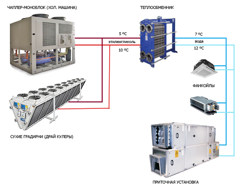 Généralement, ces systèmes sont utilisés dans les hypermarchés‚ centres commerciaux‚ bâtiments‚ construits sous terre‚ hôtels. Parfois, ils sont utilisés comme chauffage. Ensuite, via le deuxième circuit, de l'eau chauffée est fournie aux ventilo-convecteurs ou le système est commuté sur une chaudière de chauffage.
