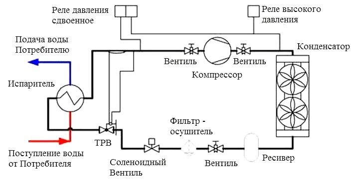 - Unités de réfrigération avec échangeur de chaleur refroidi par eau. Le plus souvent, ils sont montés dans des endroits où il est possible de refroidir le condenseur avec de l'eau courante provenant de réservoirs naturels.