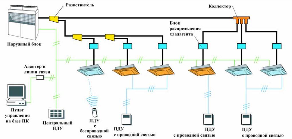 Un tel système est facile à utiliser et peut refroidir ou chauffer efficacement l'air d'une grande pièce ou de plusieurs pièces à la fois. Il n'a pas de restrictions telles que le fréon. La longueur de la ligne avec le liquide de refroidissement n'est limitée que par la capacité des pompes de surpression.