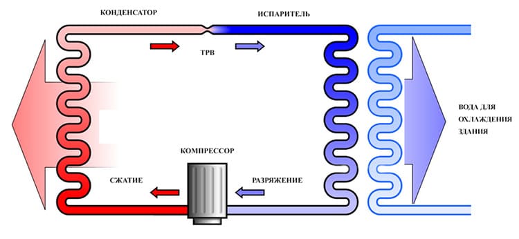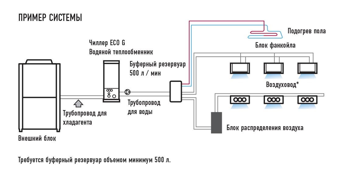 Le rôle du dispositif de refroidissement est attribué au refroidisseur - une unité externe qui produit et fournit du froid à travers des canalisations avec de l'eau ou de l'éthylène glycol circulant à travers eux. C'est ce qui le distingue des autres systèmes split, où le fréon est pompé comme liquide de refroidissement.