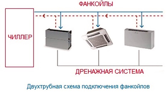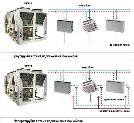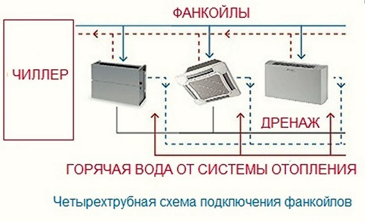 Les ventilo-convecteurs peuvent avoir un ou deux échangeurs de chaleur, respectivement, le système refroidisseur-ventilo-convecteur peut être à deux tubes ou à quatre tubes. Dans la première version, deux tuyaux partent de l'échangeur de chaleur, à travers lequel seul le fluide de travail froid et chaud circule, et dans la seconde, pour fournir le liquide de refroidissement du refroidisseur au ventilo-convecteur et fournir de l'eau chaude du chauffage à la deuxième chaleur échangeur.
