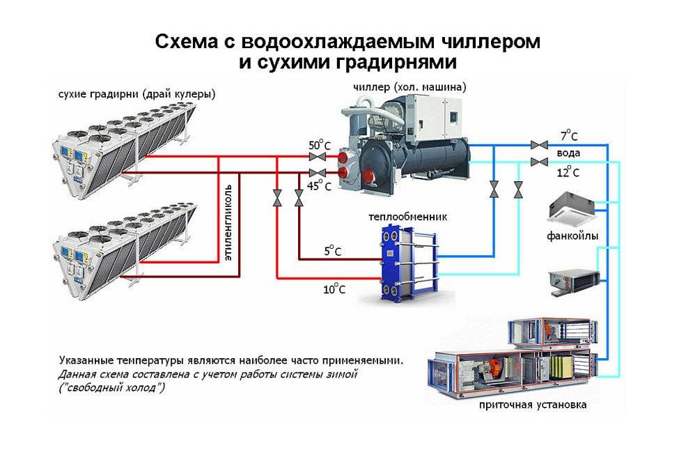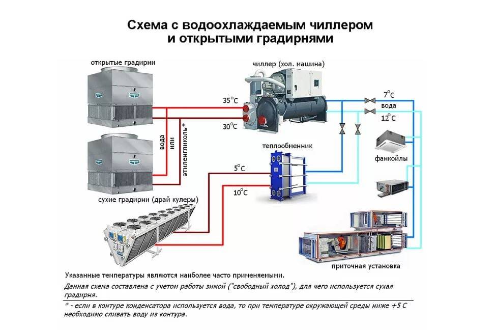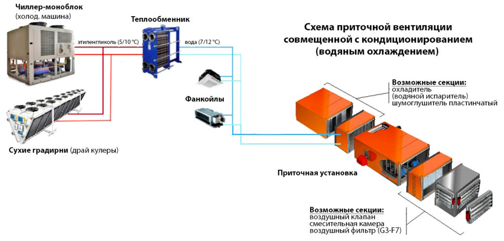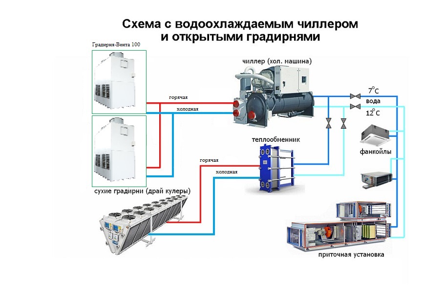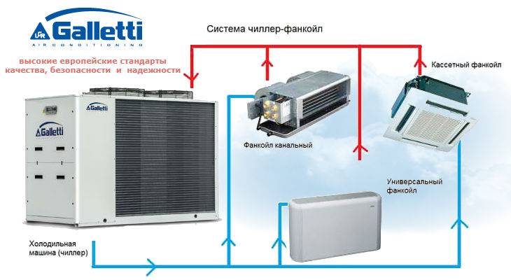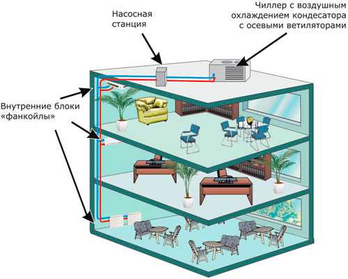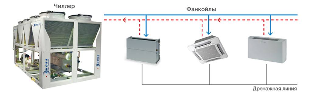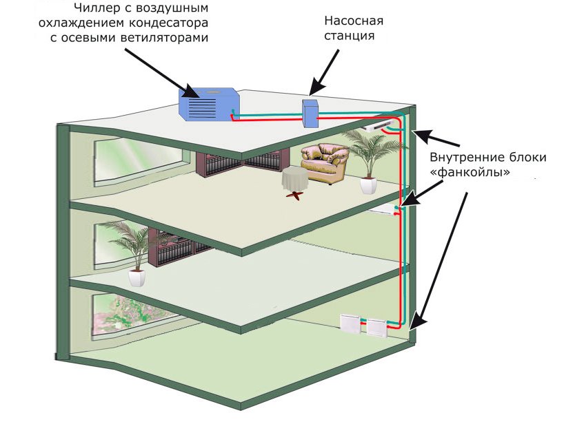 Les principaux éléments du système sont une station de pompage, un refroidisseur, un ventilo-convecteur. Le ventilo-convecteur peut être installé à grande distance du refroidisseur. Tout dépend de la puissance de la pompe. Le nombre de ventilo-convecteurs est proportionnel à la capacité du refroidisseur