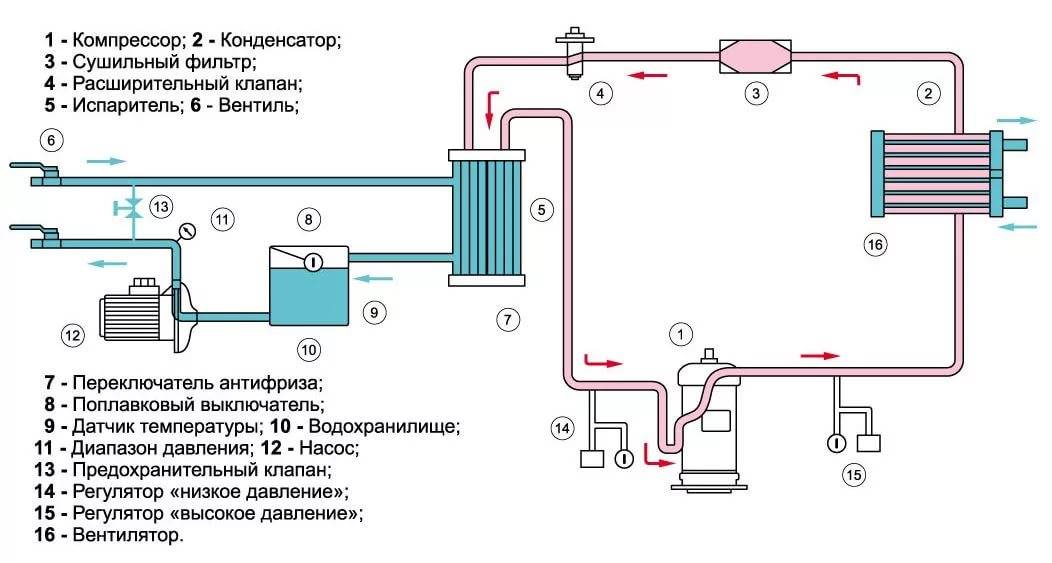 - Refroidissement direct.. L'option la plus courante. Le liquide est refroidi dans l'échangeur de chaleur liquide/fréon. La différence de température entre l'entrée et la sortie n'est pas supérieure à 7°C. Mode climatisation standard +7/12°С.