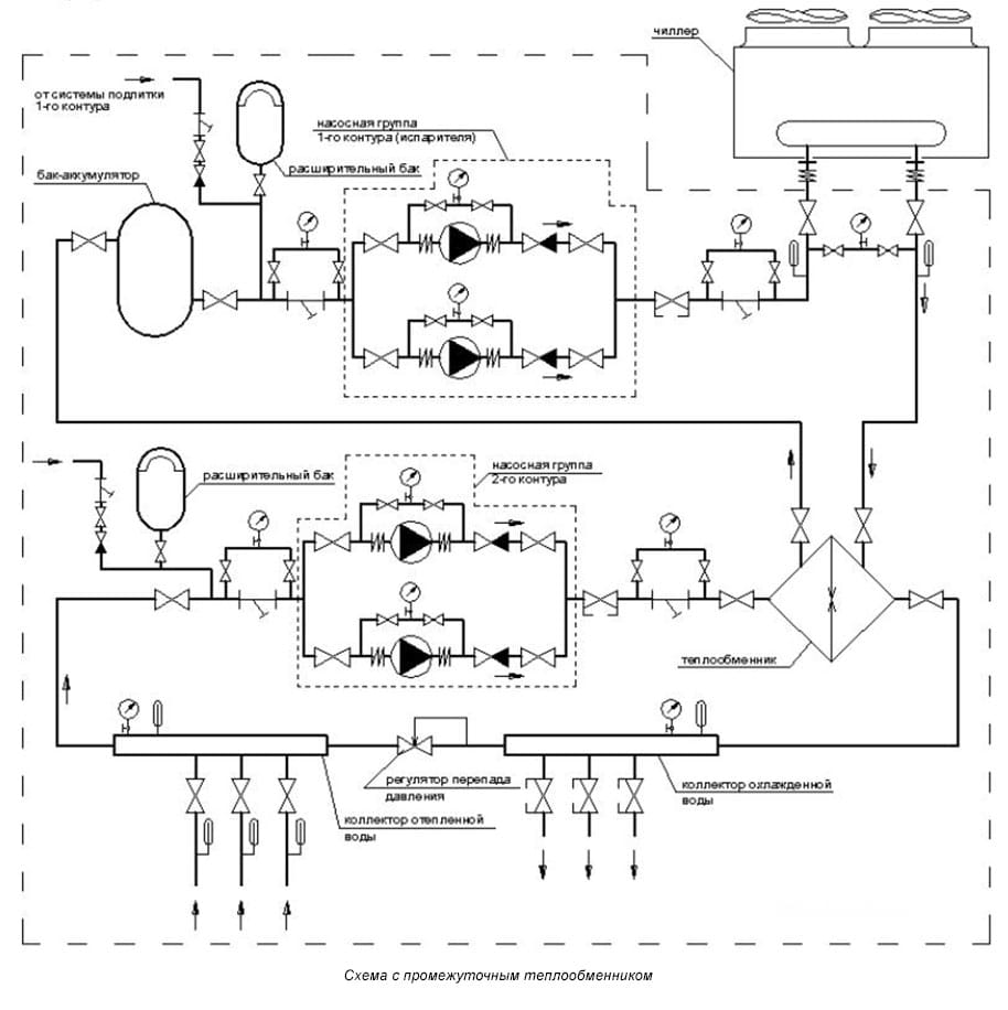 . - Si les tuyaux ont une isolation thermique de haute qualité et que le caloporteur a une capacité thermique élevée, la distance entre les pièces dans lesquelles la climatisation est effectuée et le refroidisseur n'a pas d'importance. Vous pouvez l'installer à une distance considérable