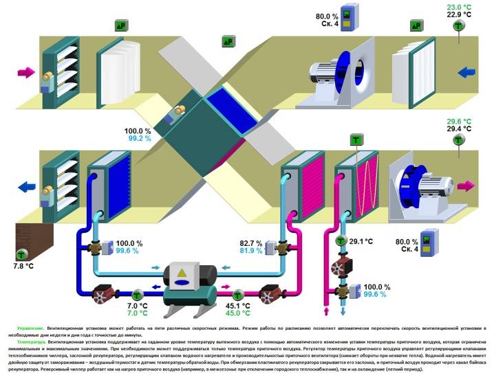 Il reçoit un liquide à basse température, puis transfère le froid vers l'air ambiant‚ et le liquide chauffé retourne vers le refroidisseur. Des ventilo-convecteurs sont installés dans toutes les pièces. Chacun d'eux travaille selon un programme individuel.