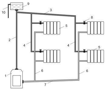 Le schéma associé est une variante du schéma classique à la différence que le sens de circulation du liquide de refroidissement dans l'alimentation et le retour est le même. Ce schéma est utilisé dans les systèmes de chauffage avec des branches longues et éloignées. L'utilisation d'un schéma de passage vous permet de réduire la résistance hydraulique de la branche et de répartir uniformément le liquide de refroidissement sur tous les radiateurs.
