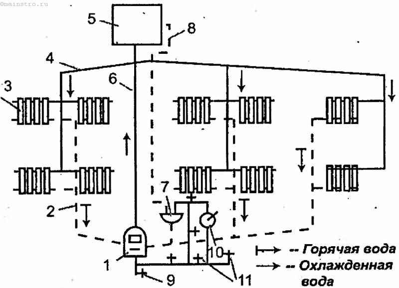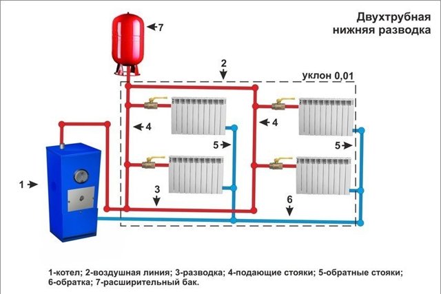 2. Bitube. Ici, l'eau chauffée entre dans les appareils de chauffage par une ligne et sort par la seconde. L'option la plus courante et la plus fiable pour tous les bâtiments résidentiels.
