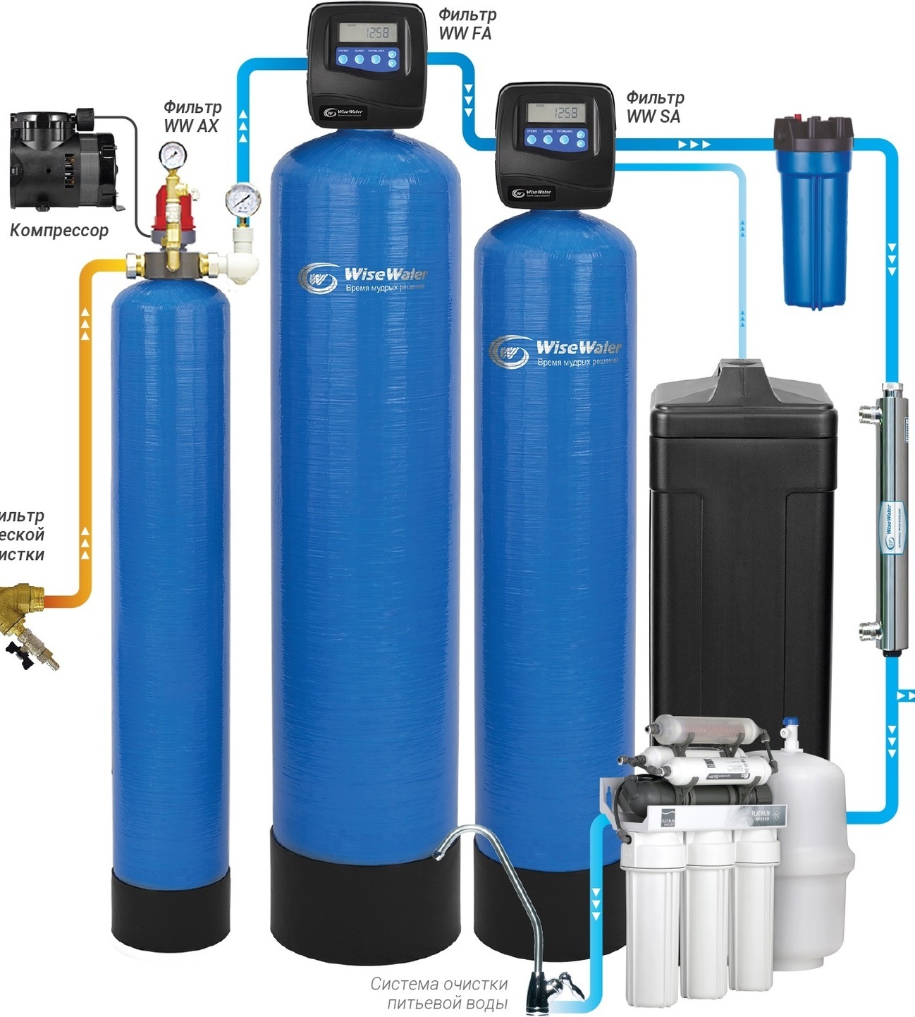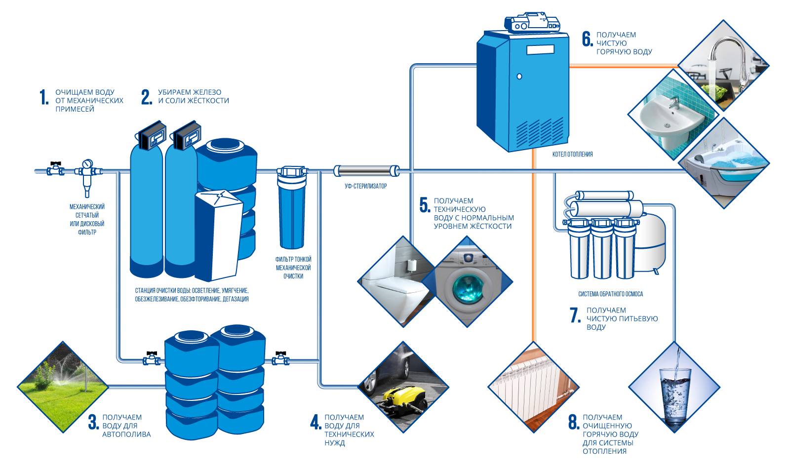 Le traitement en plusieurs étapes ne peut être utilisé que pour boire du liquide dans la cuisine, où il est important d'obtenir un liquide propre et sûr. Des filtres grossiers peuvent être placés à l'entrée du système centralisé, qui combattent les impuretés solides et difficiles