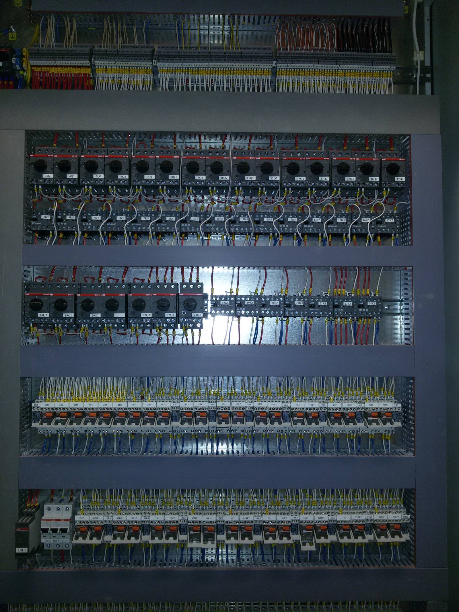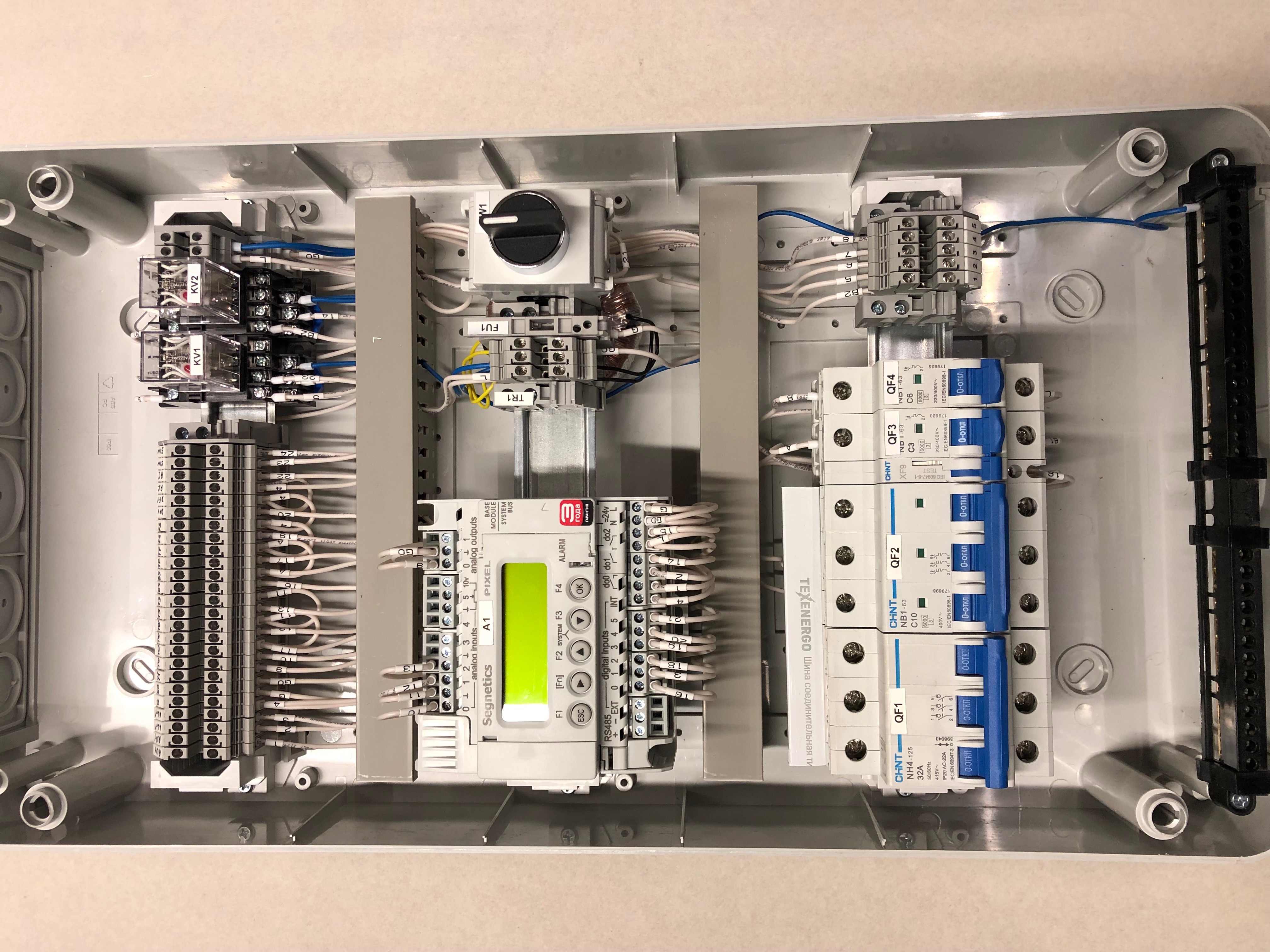L'assemblage lui-même prend un peu de temps: tous les appareils sont montés à tour de rôle sur plusieurs rangées, les fils sont soigneusement attachés aux borniers et disposés le long des lignes en faisceaux organisés, puis ils sont sortis.
